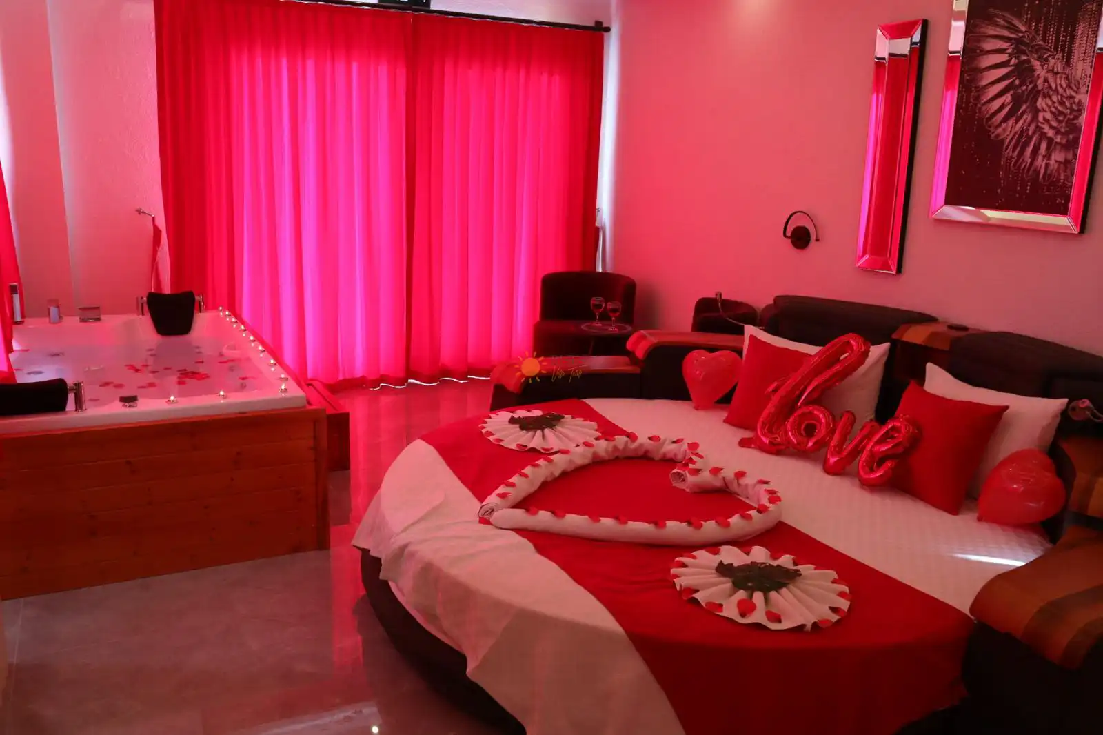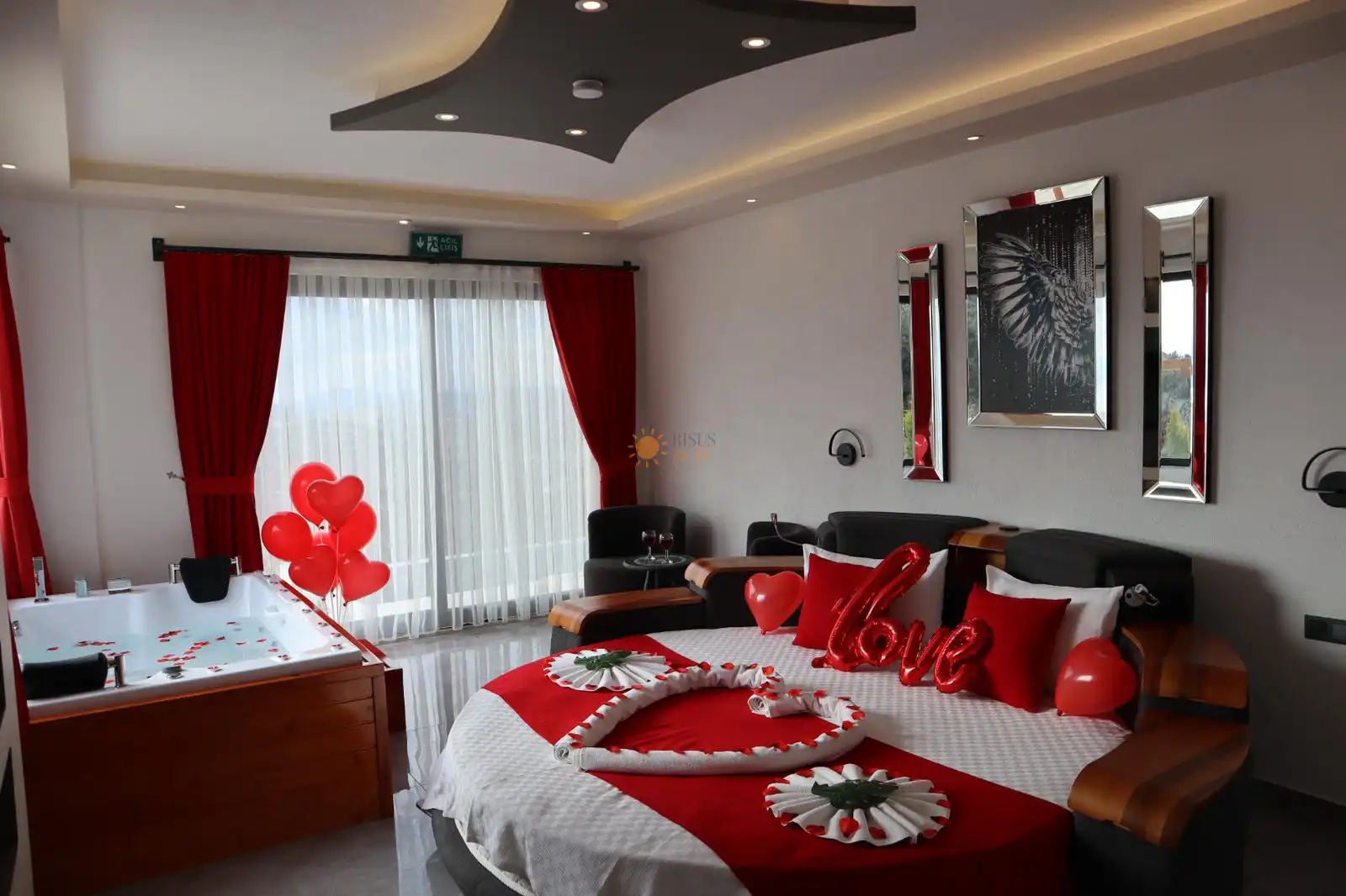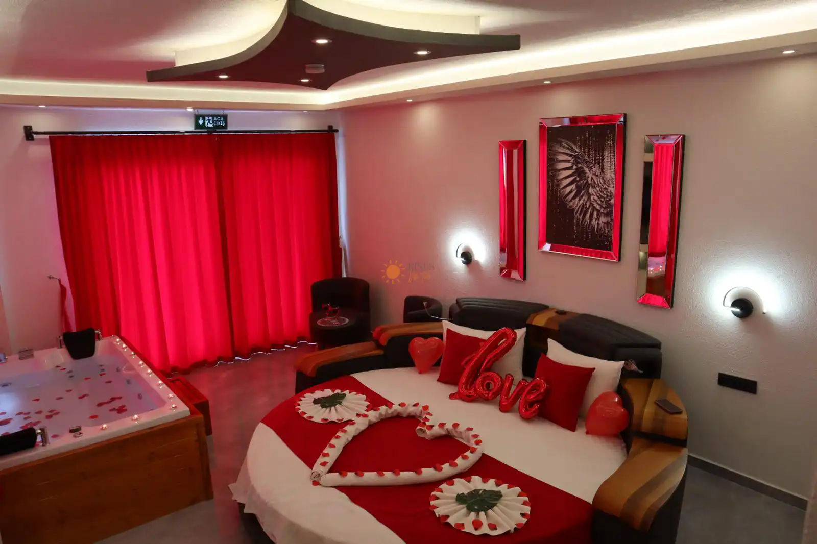 Çift Kişilik Yatak, Jakuzi, Banyo/WC, TV, 2 Komodin, Elbise dolabı, Makyaj Masası, Klima