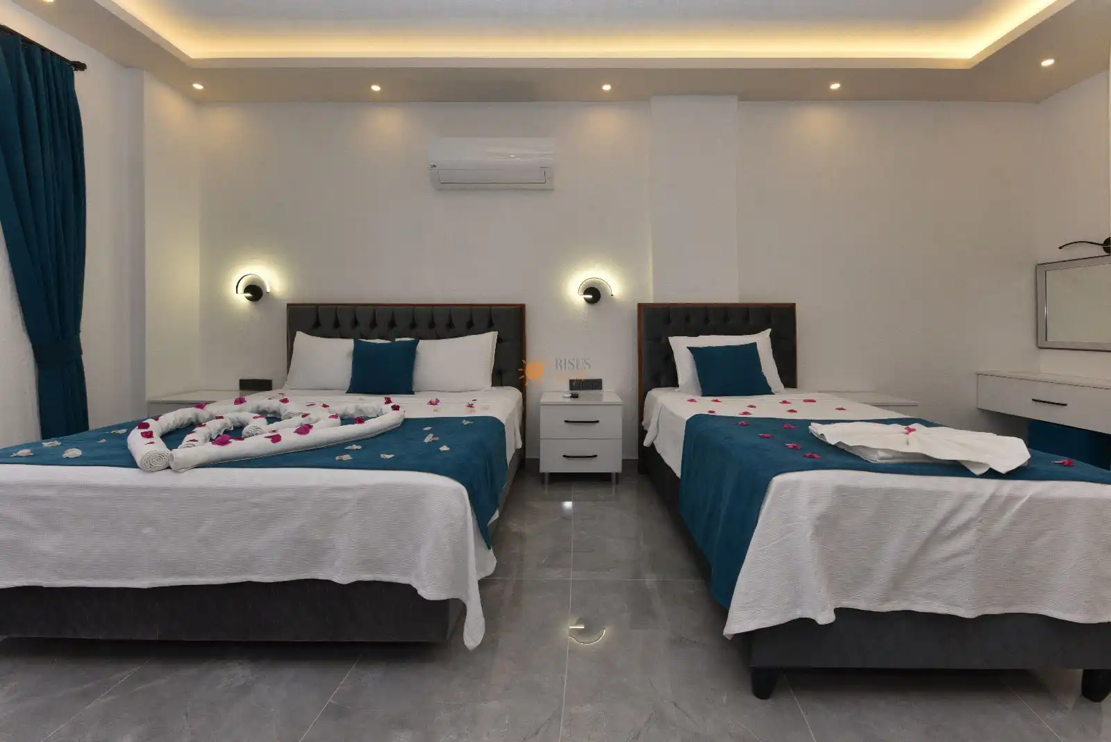 2 Tek Kişilik Yatak, Çift Kişilik Yatak, Banyo/WC, TV, 2 Komodin, Elbise dolabı, Makyaj Masası, Klima