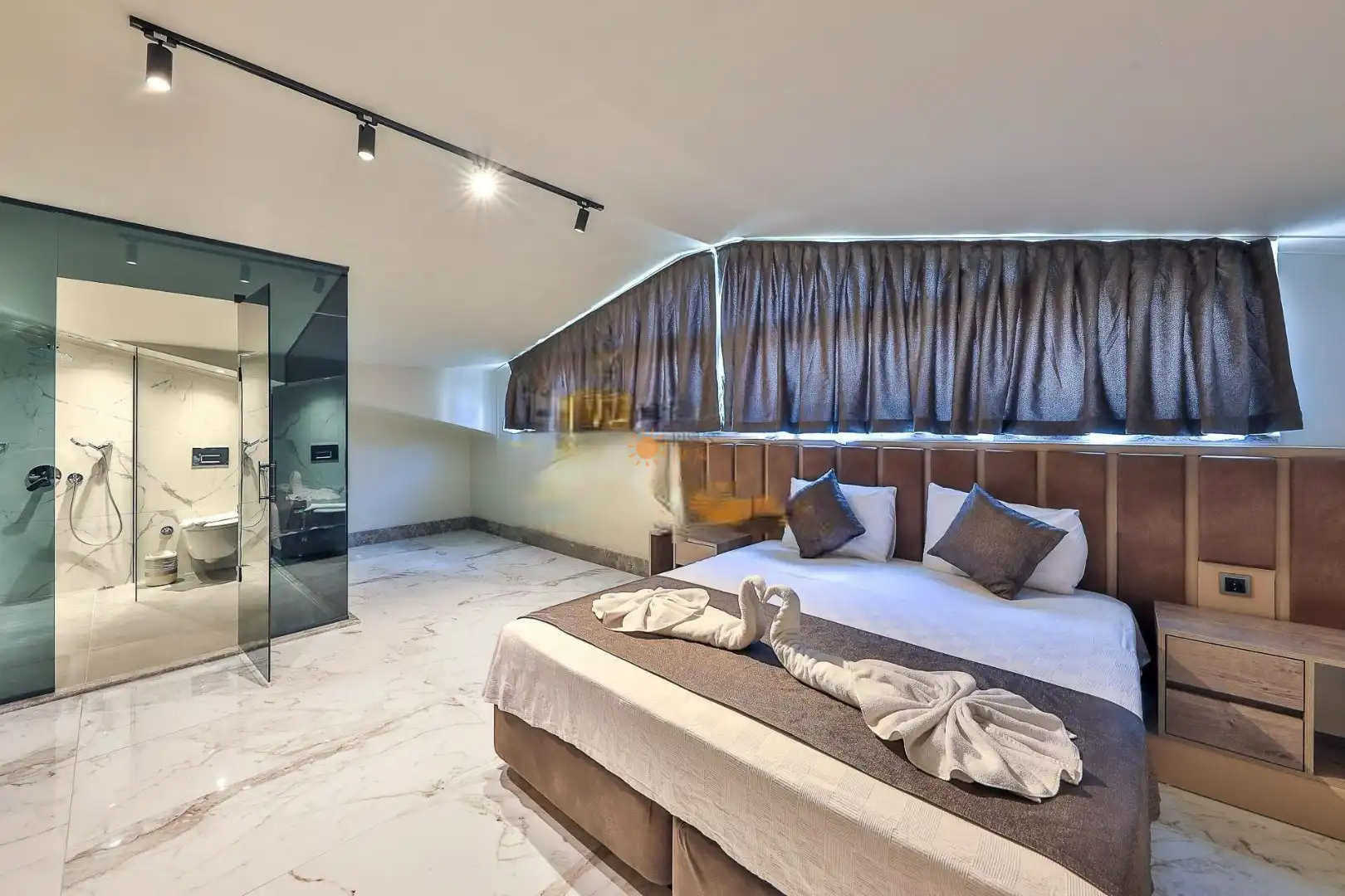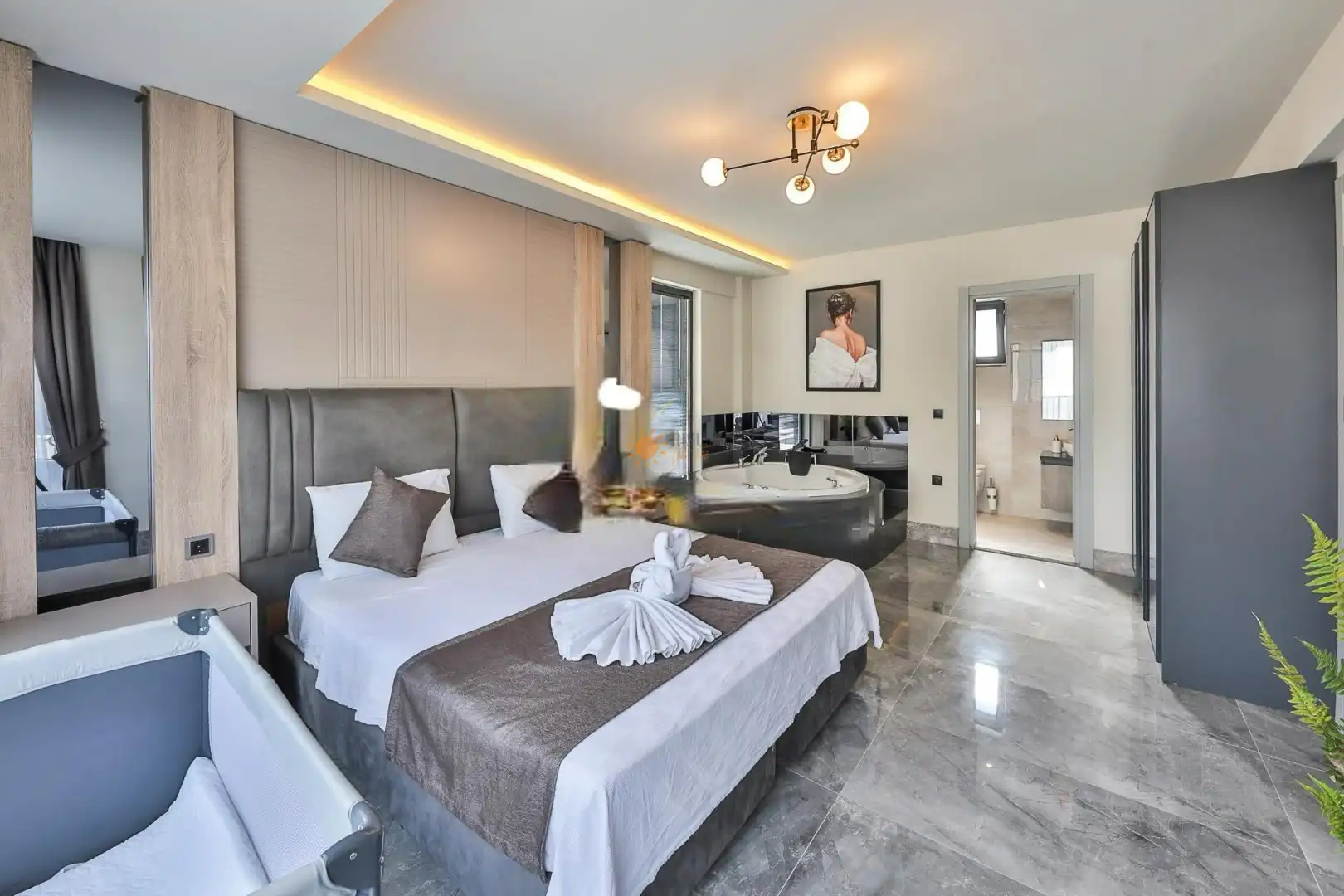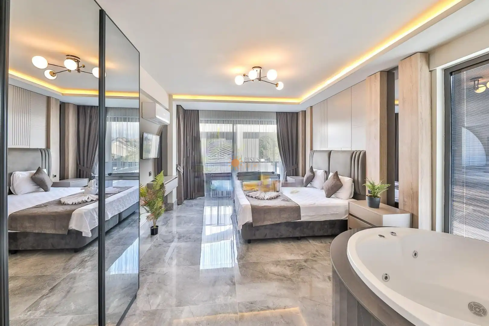 Çift Kişilik Yatak, Jakuzi, Banyo/WC, TV, 2 Komodin, Elbise dolabı, Makyaj Masası, Klima