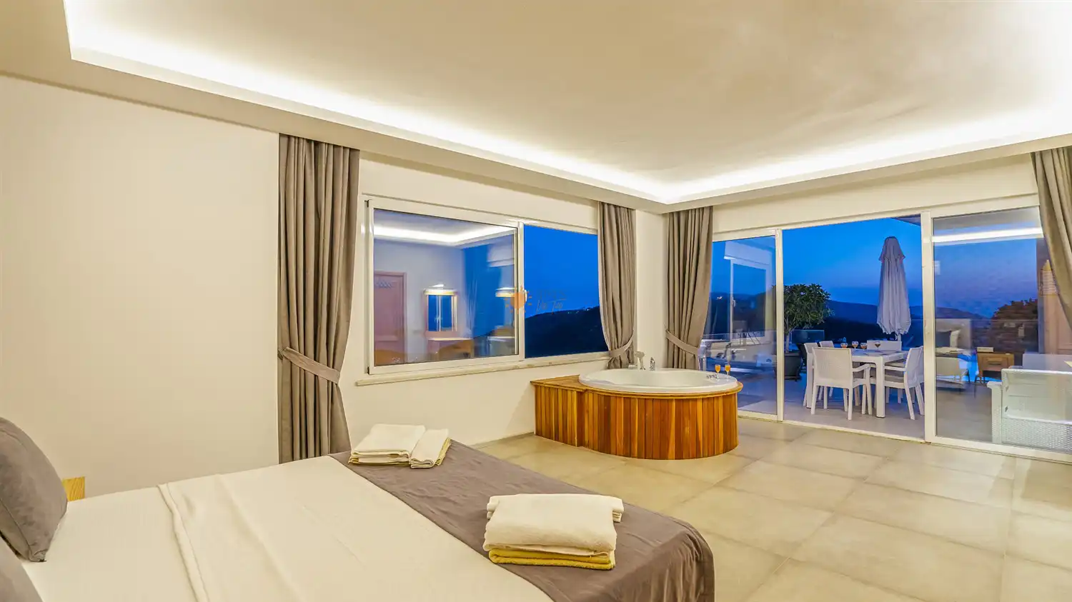 Çift Kişilik Yatak, Jakuzi, Banyo/WC, 2 Komodin, Elbise dolabı, Makyaj Masası, Klima
