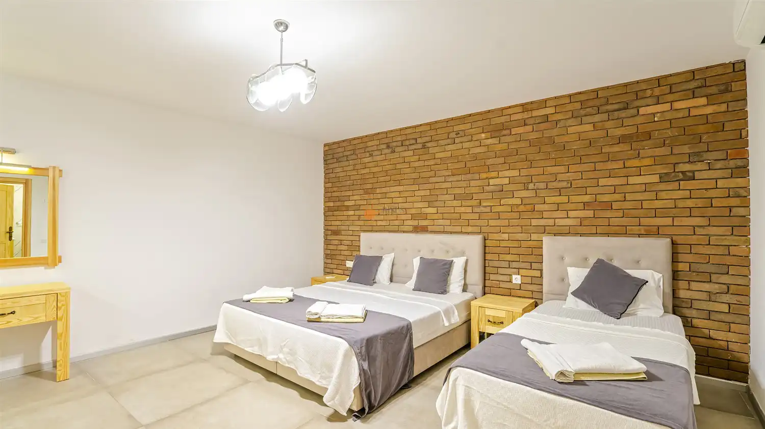 Tek Kişilik Yatak, Çift Kişilik Yatak, Banyo/WC, 2 Komodin, Elbise dolabı, Makyaj Masası, Klima