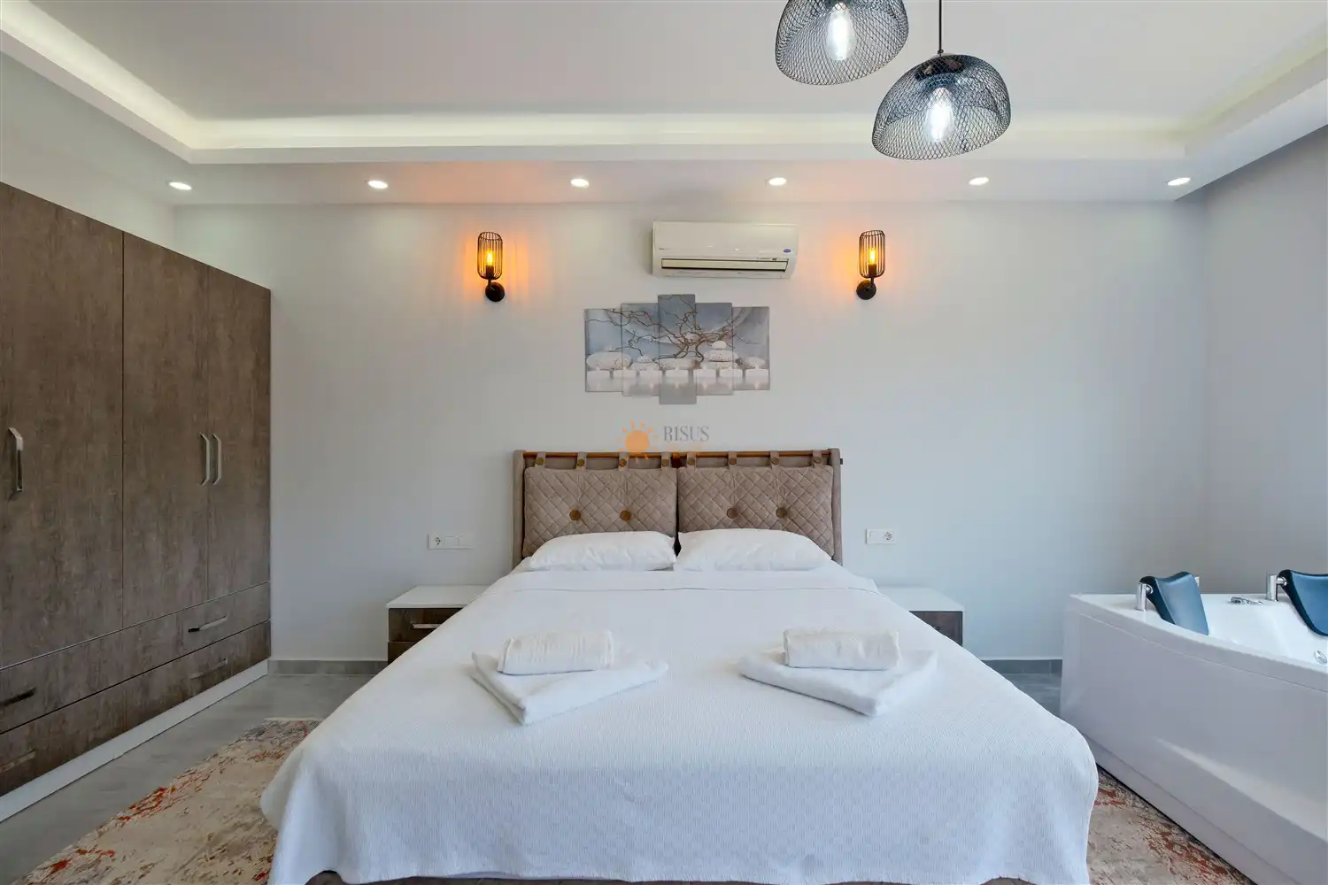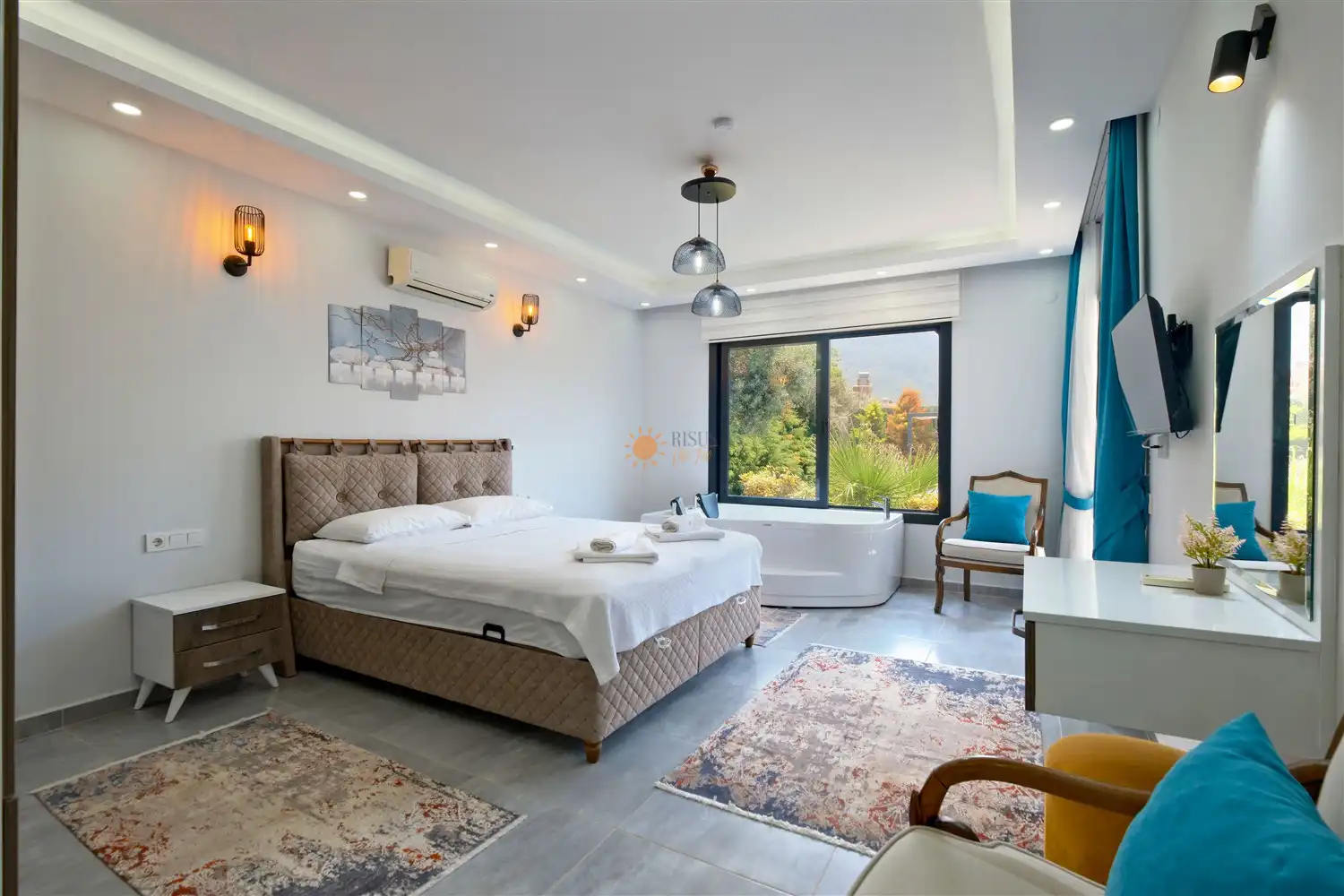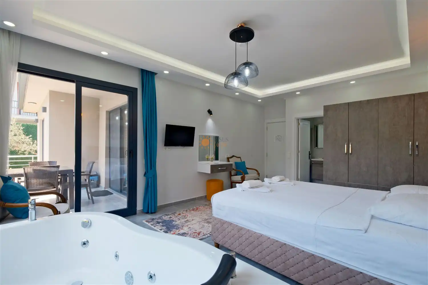 Çift Kişilik Yatak, Jakuzi, Sauna, Banyo/WC, TV, 2 Komodin, Elbise dolabı, Makyaj Masası, Klima