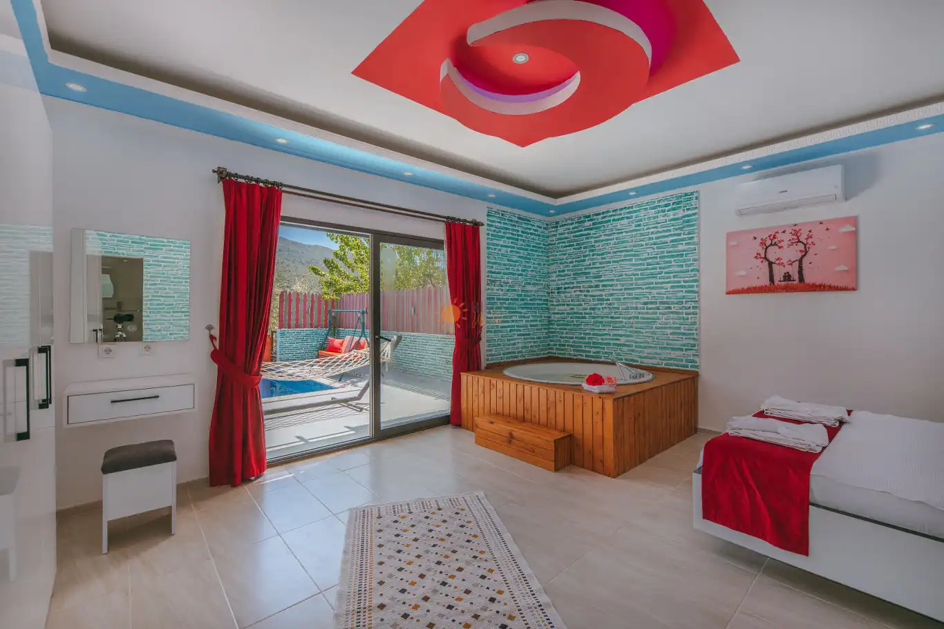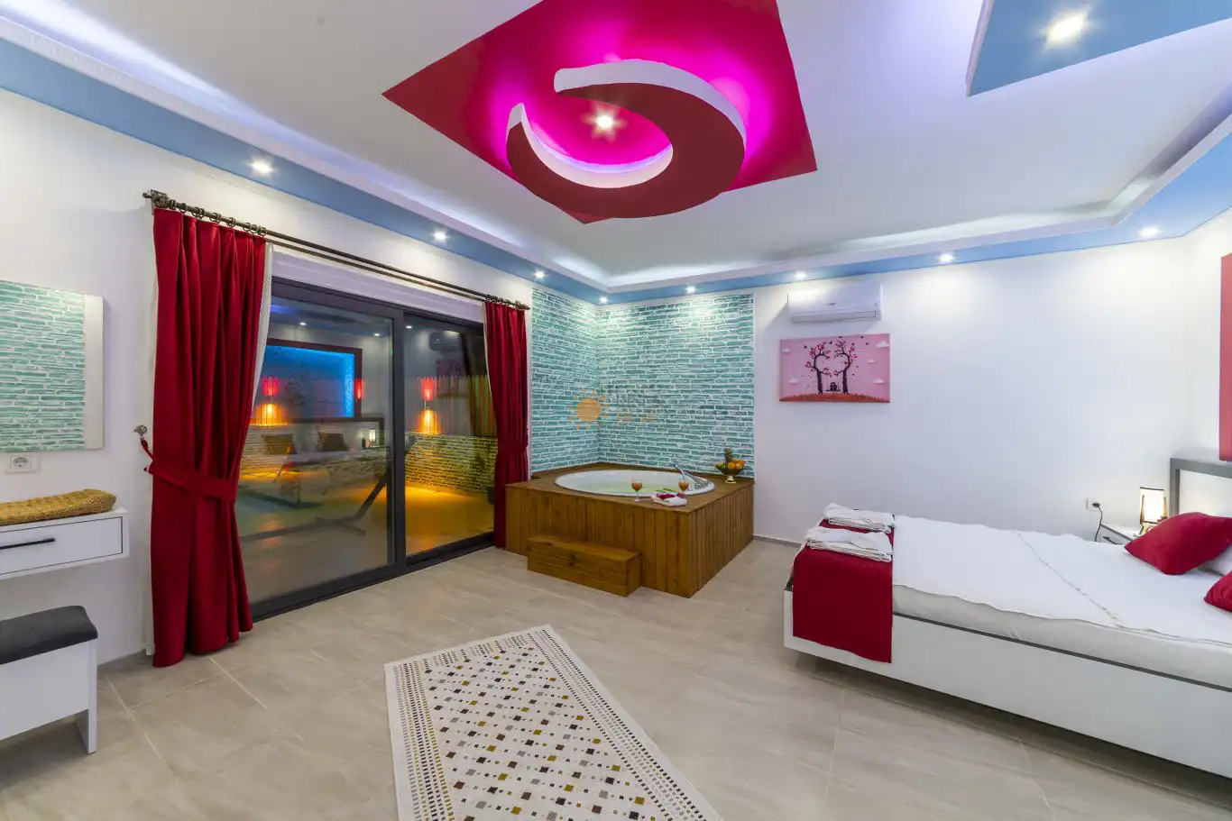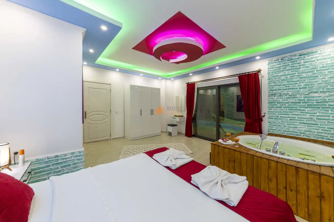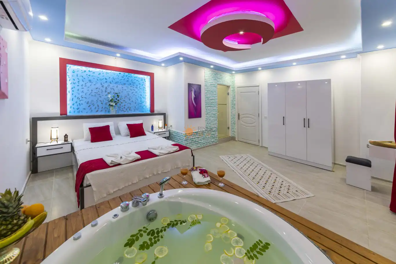 Çift Kişilik Yatak, Jakuzi, Banyo/WC, 2 Komodin, Elbise dolabı, Makyaj Masası, Klima