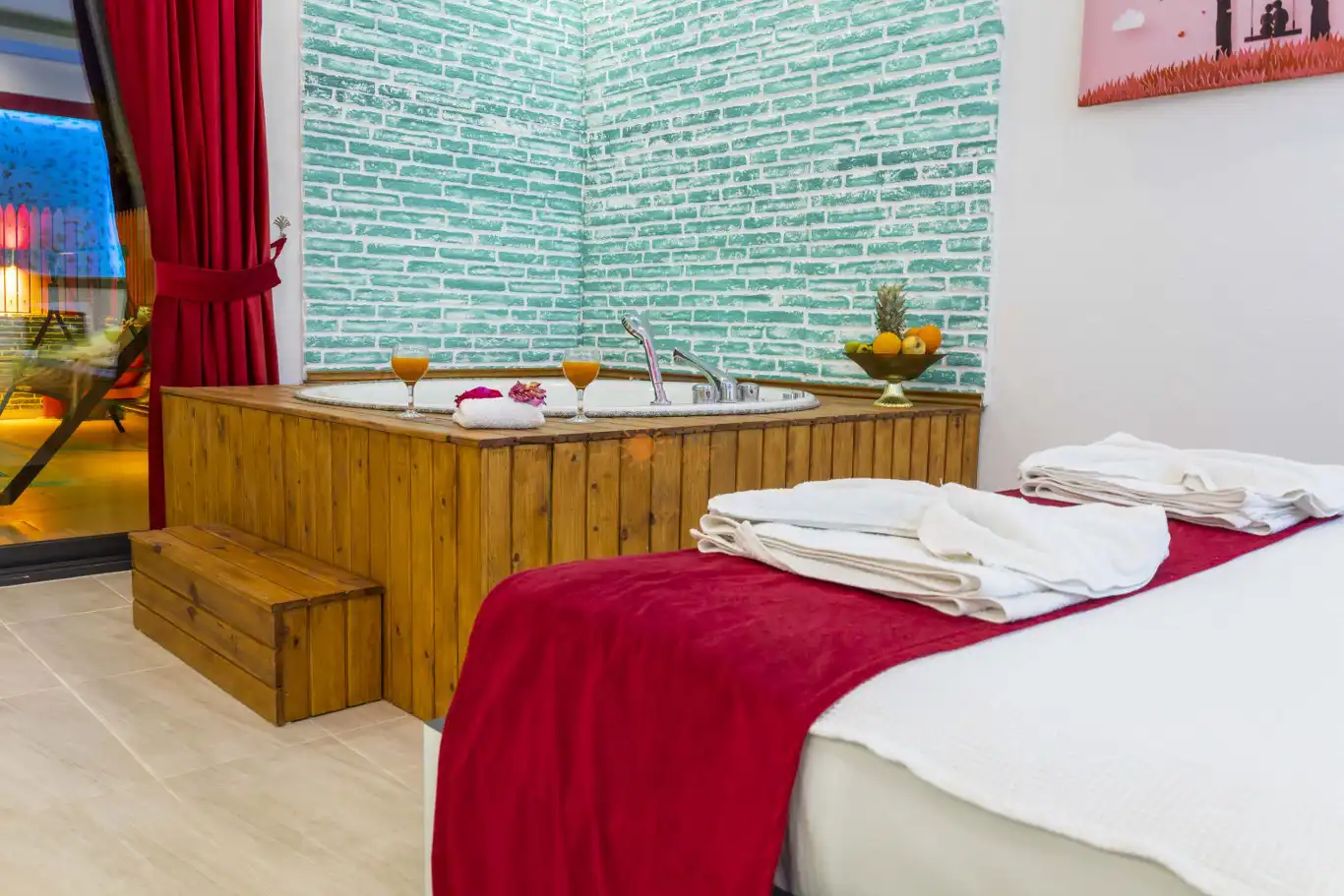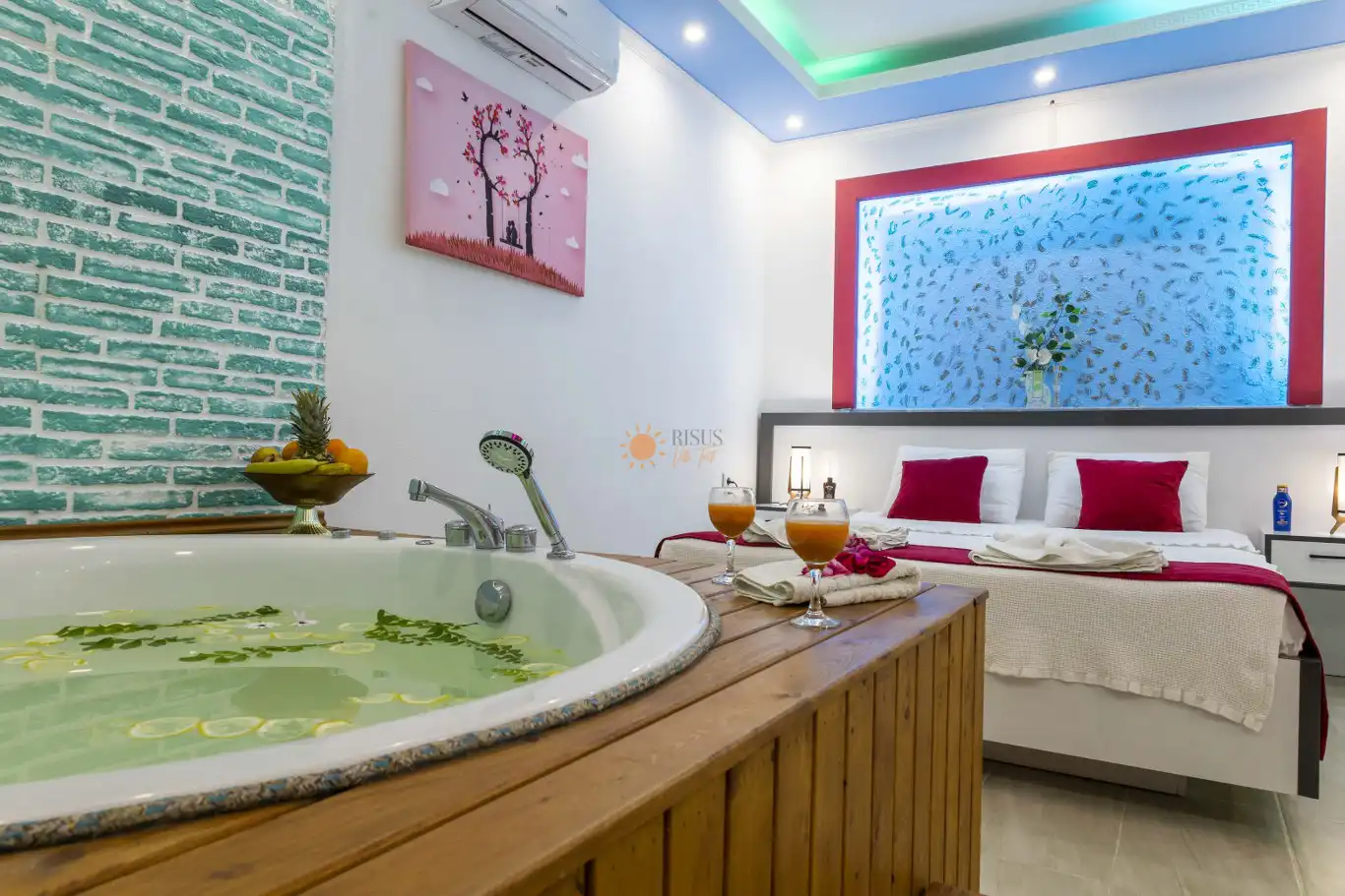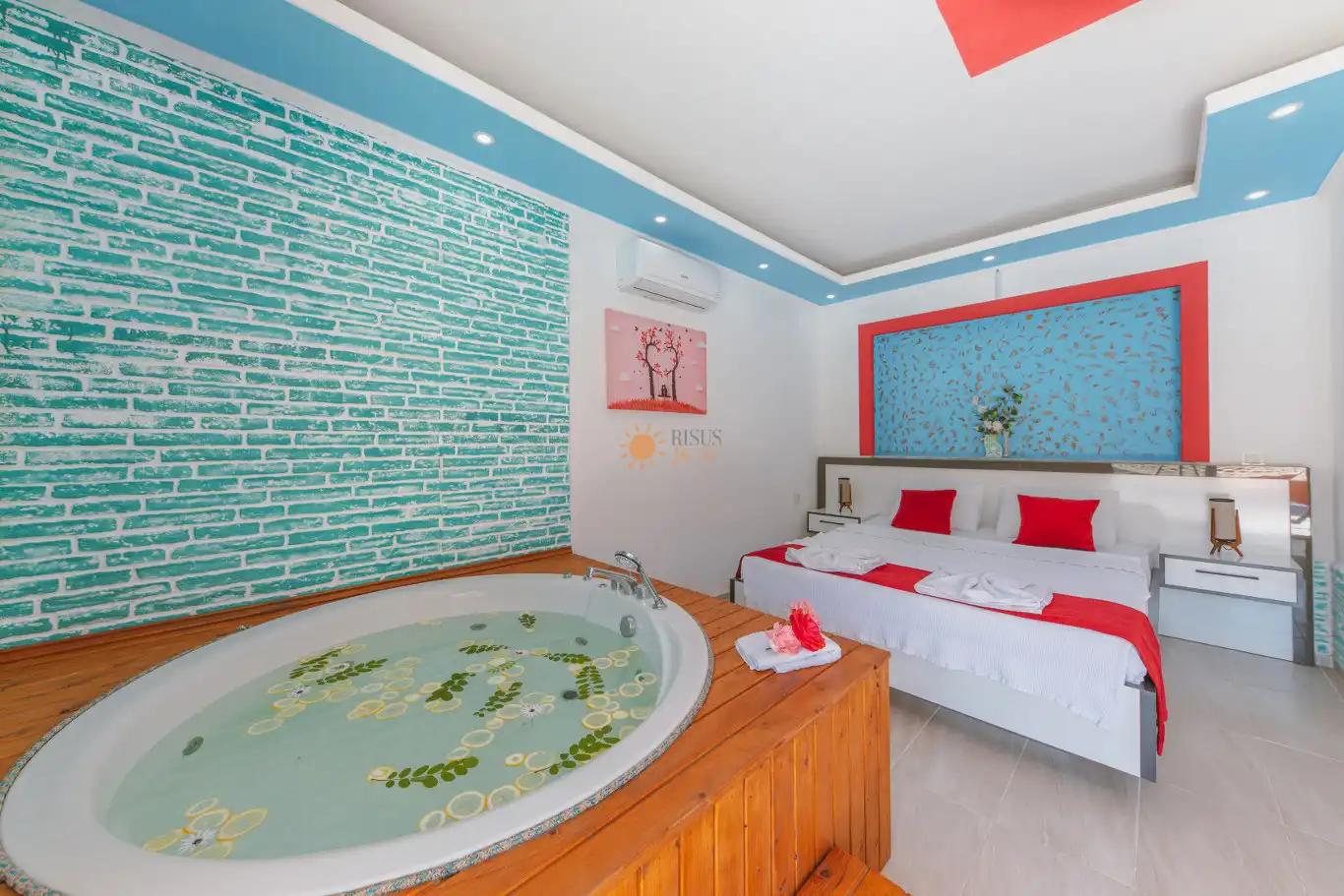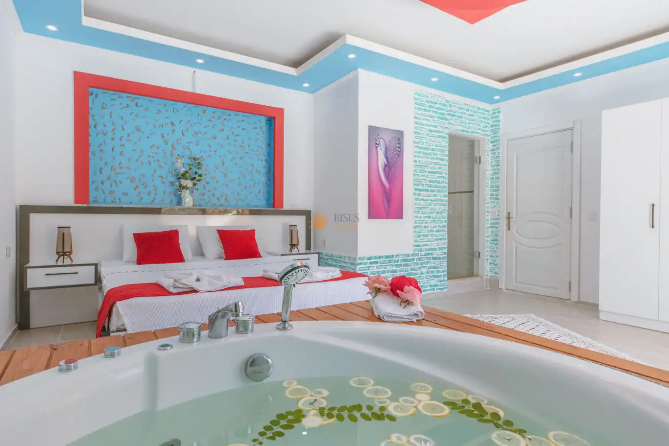 Çift Kişilik Yatak, Jakuzi, Banyo/WC, 2 Komodin, Elbise dolabı, Makyaj Masası, Klima