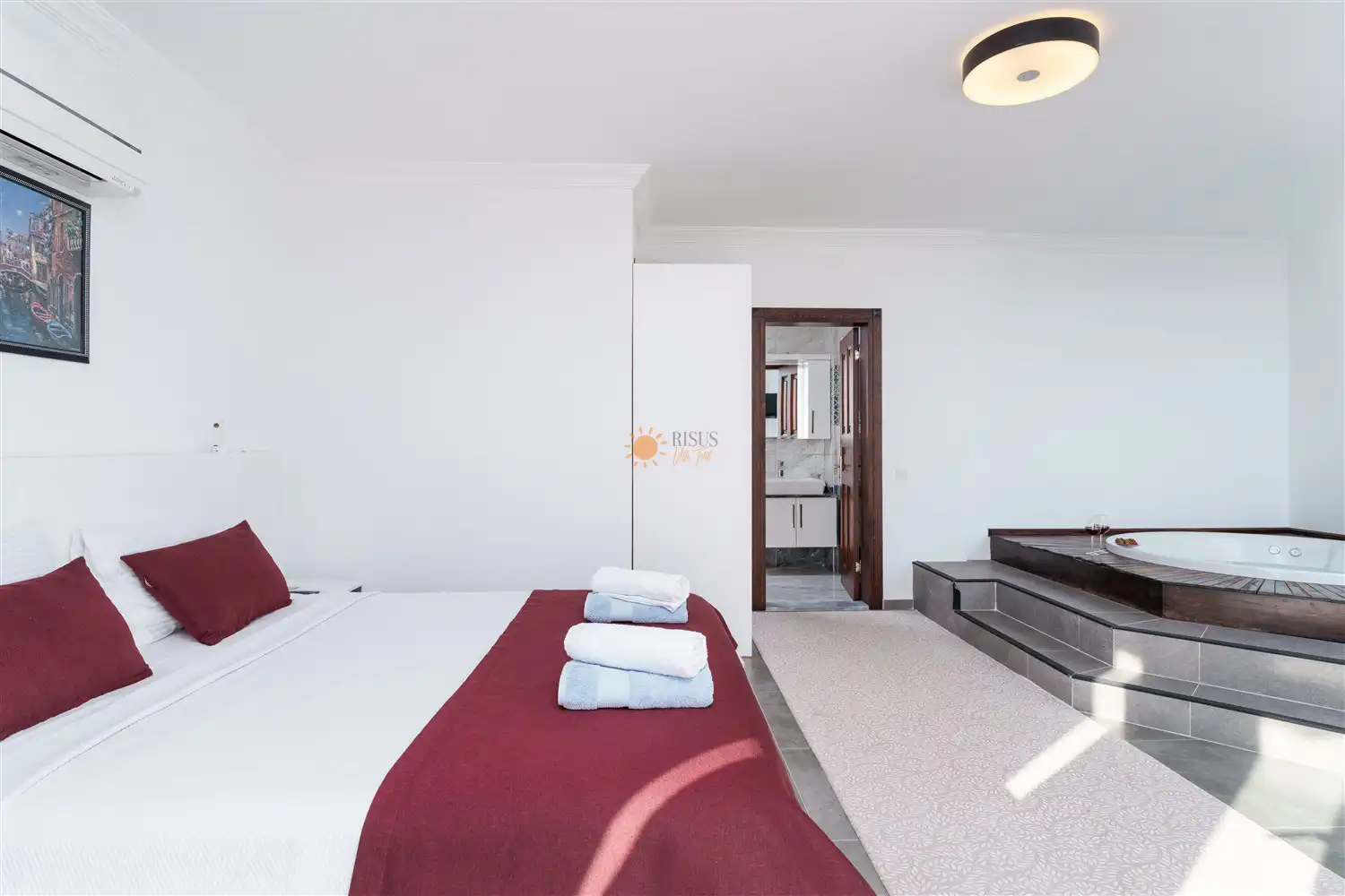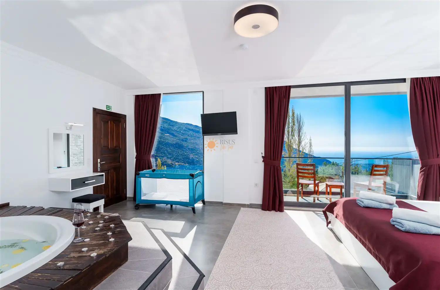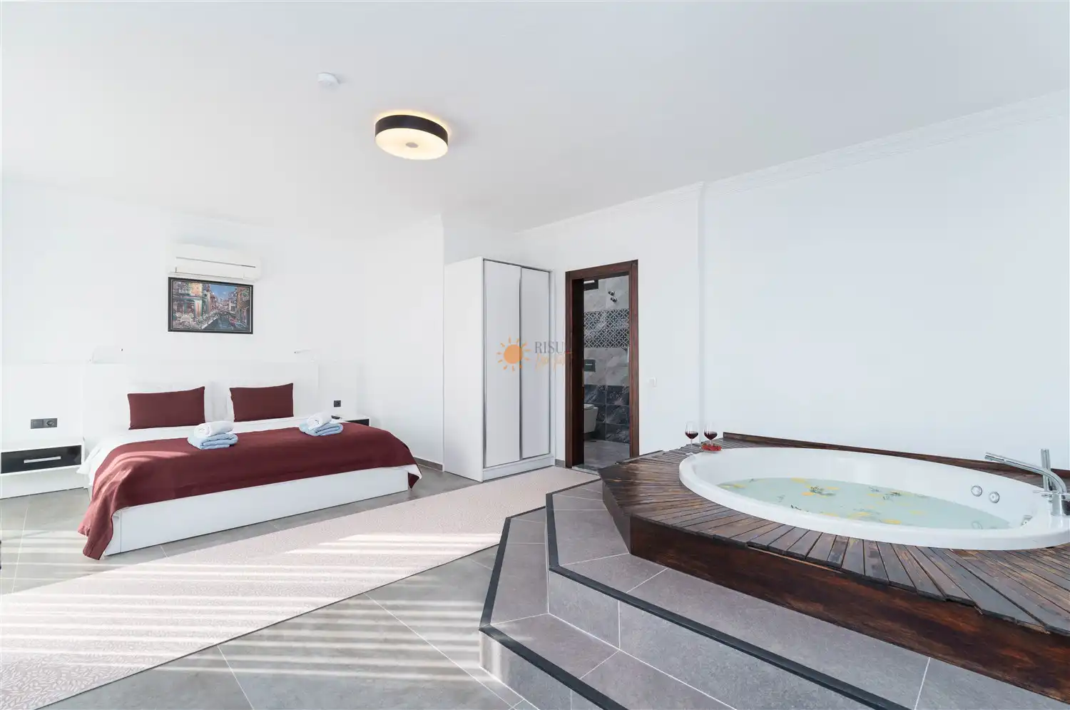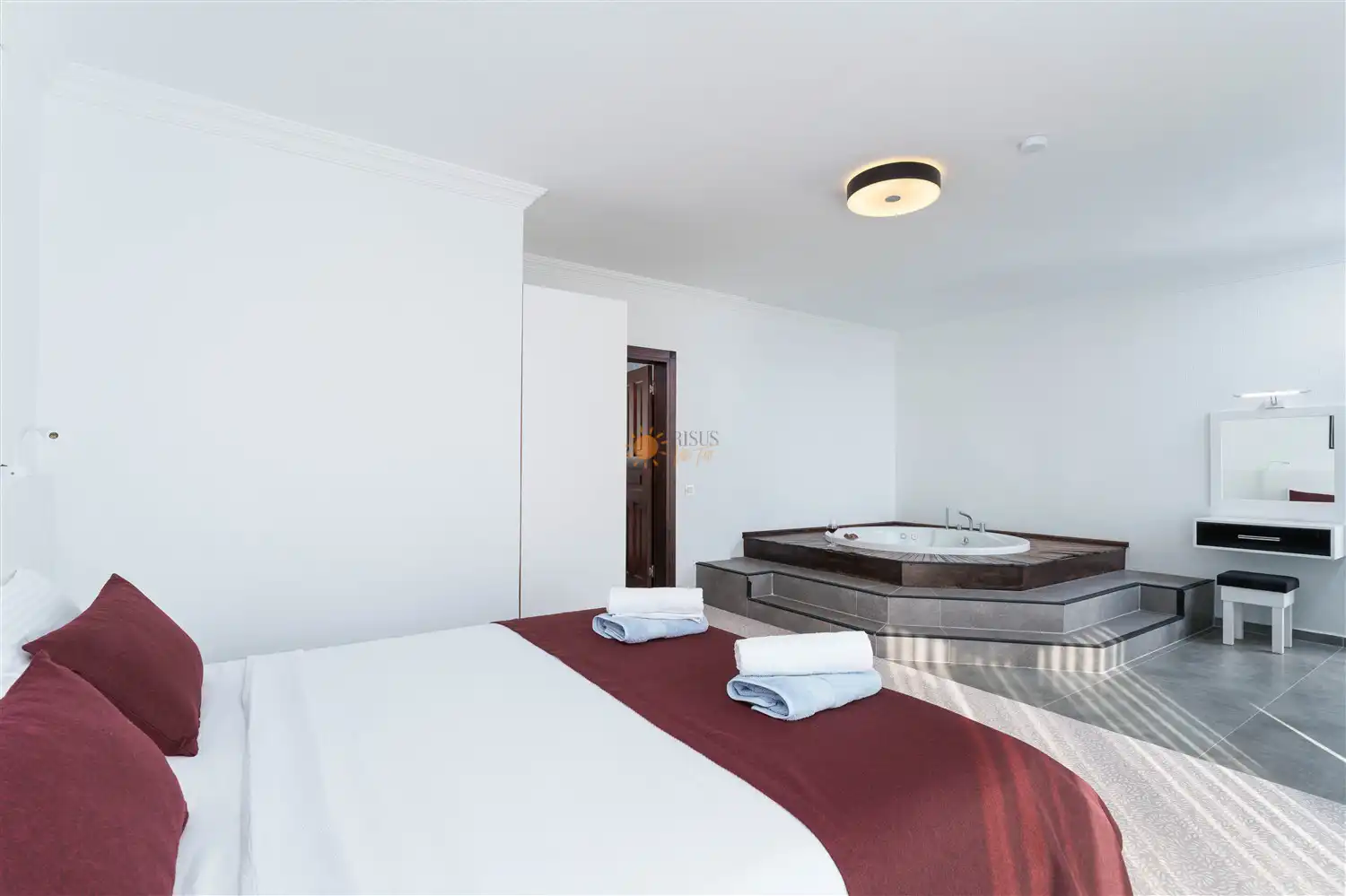 Çift Kişilik Yatak, Jakuzi, Banyo/WC, TV, 2 Komodin, Elbise dolabı, Makyaj Masası, Klima