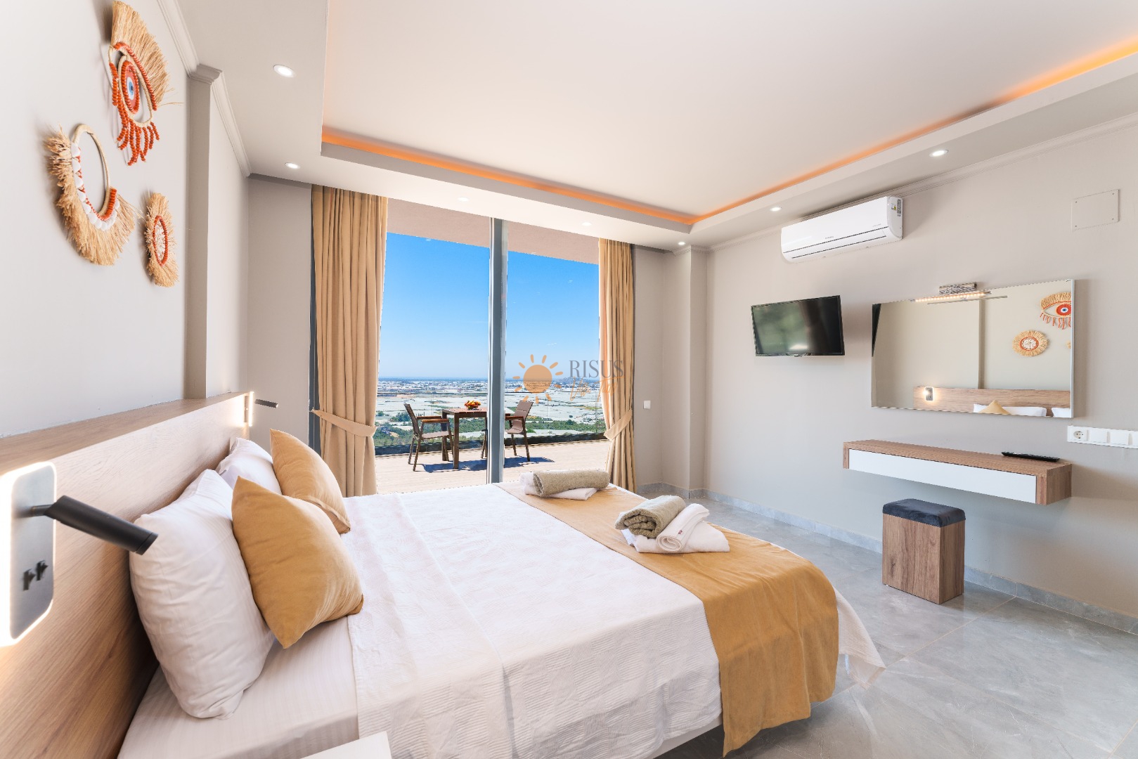 Çift Kişilik Yatak, Banyo/WC, TV, 2 Komodin, Elbise dolabı, Makyaj Masası, Klima