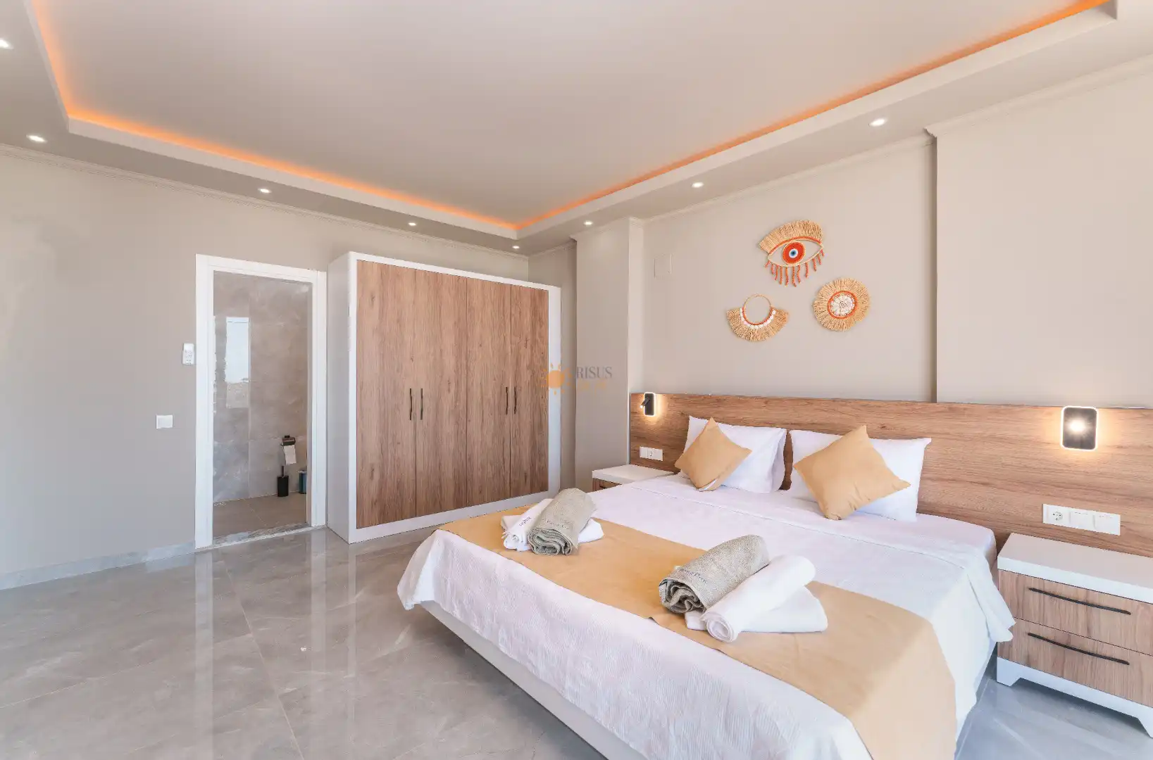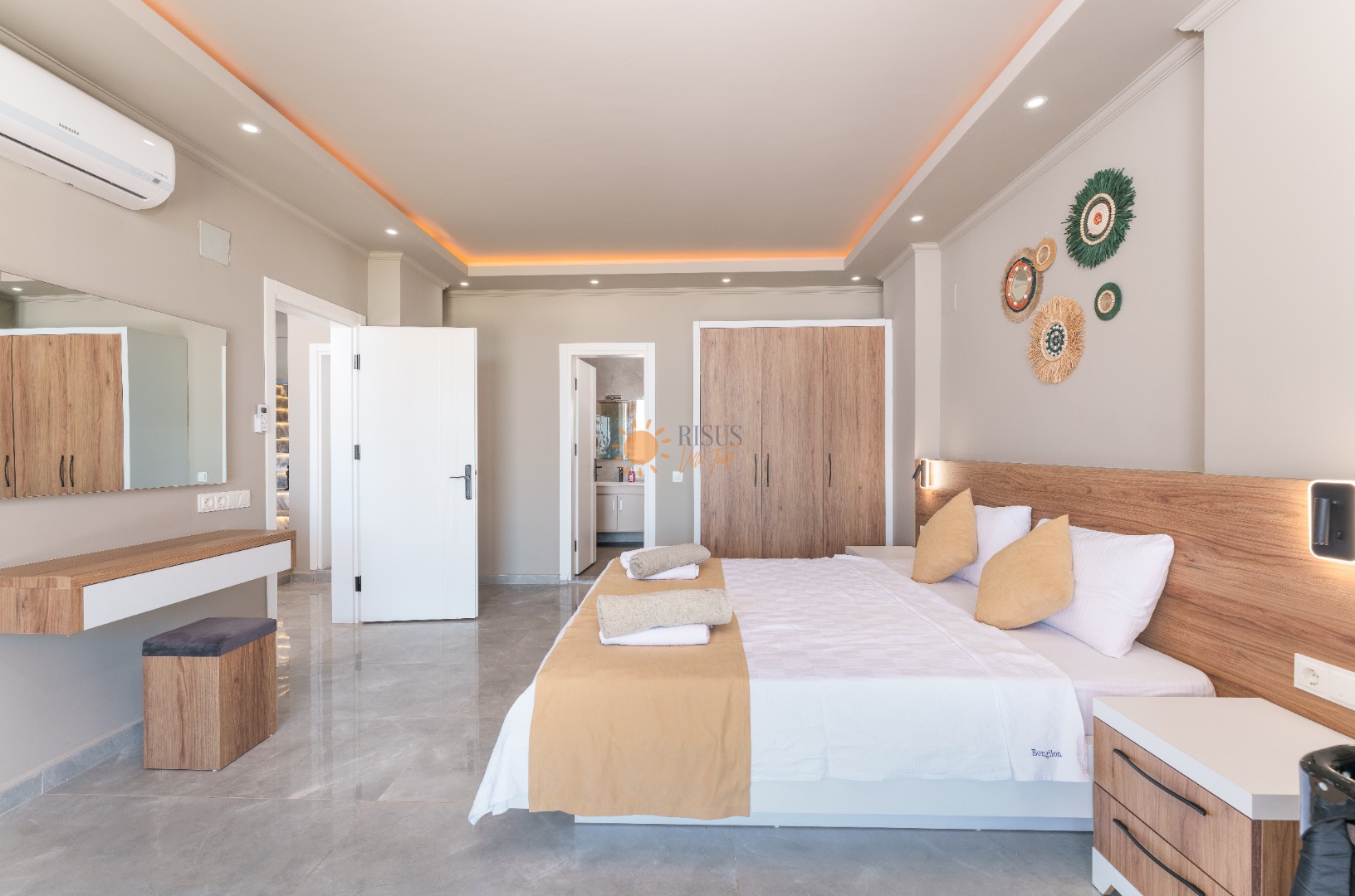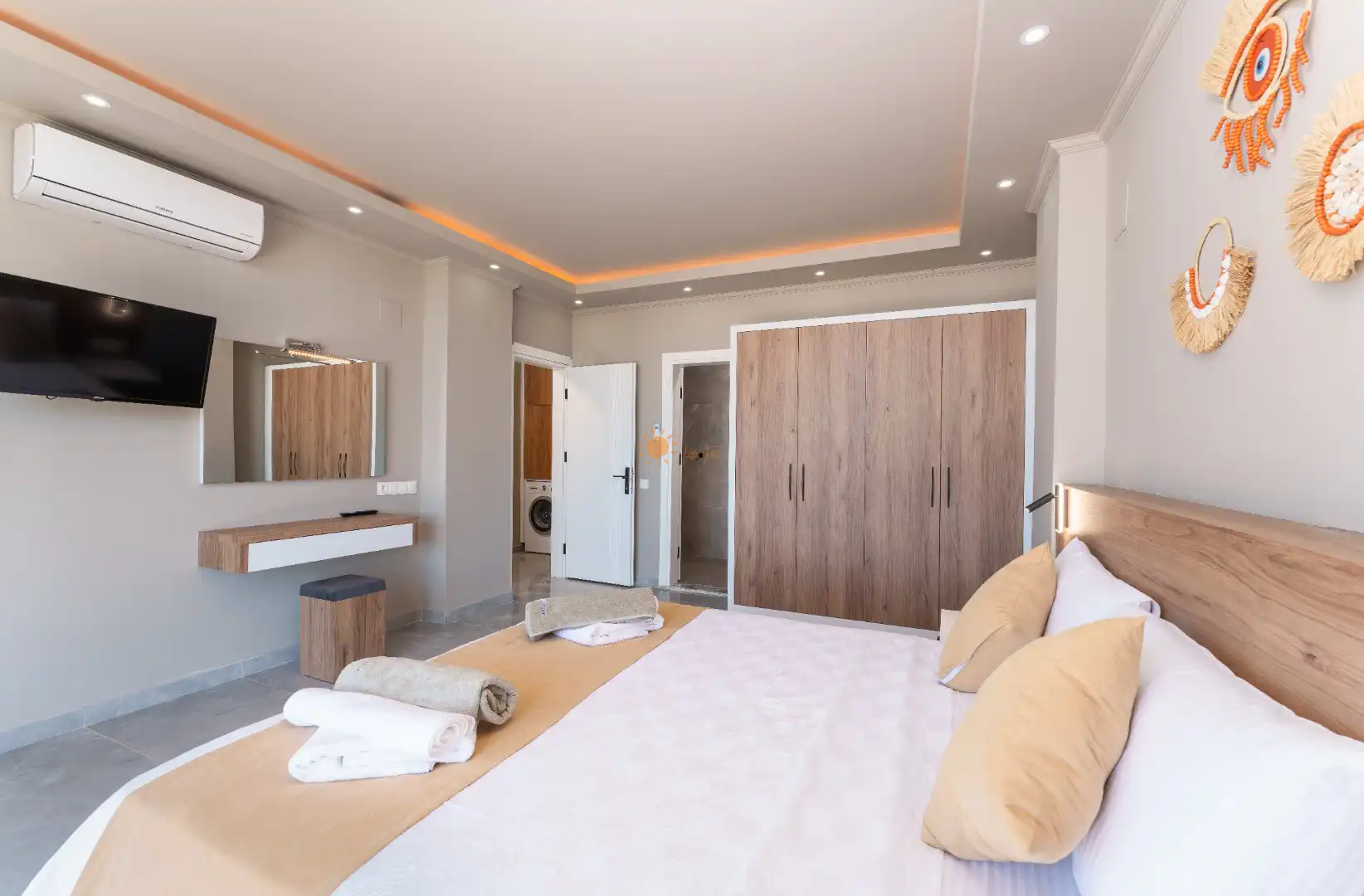 Çift Kişilik Yatak, Banyo/WC, 2 Komodin, Elbise dolabı, Makyaj Masası, Klima