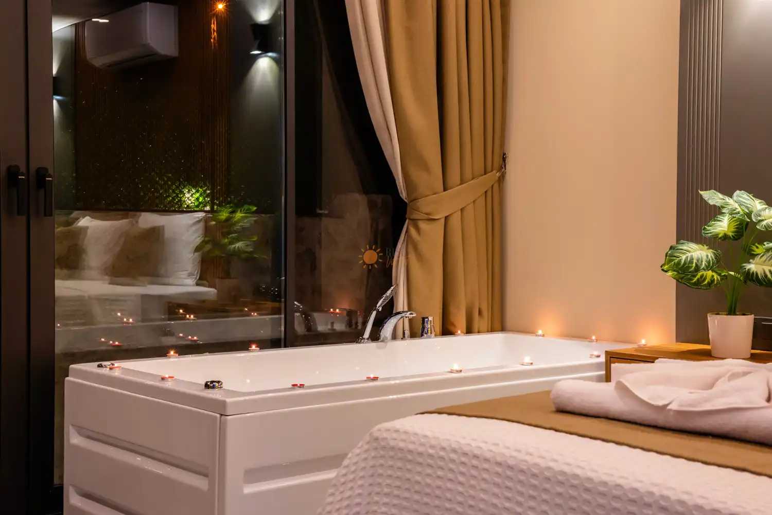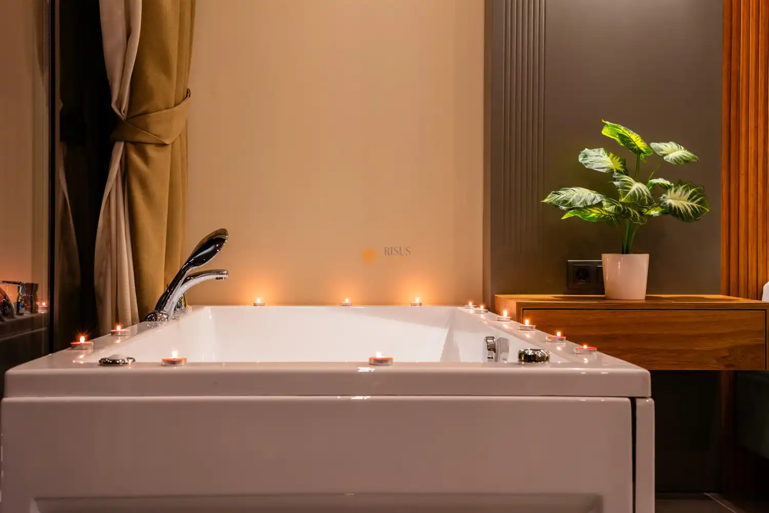 Çift Kişilik Yatak, Jakuzi, Banyo/WC, 2 Komodin, Makyaj Masası, Klima