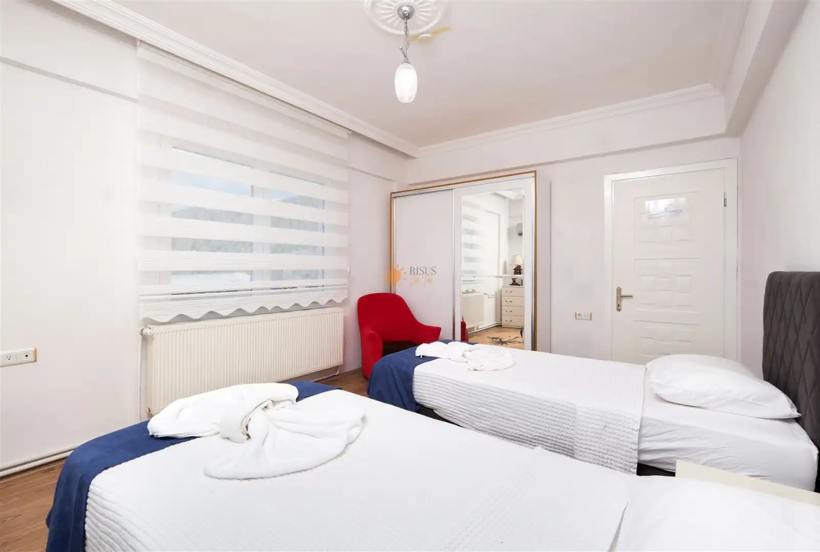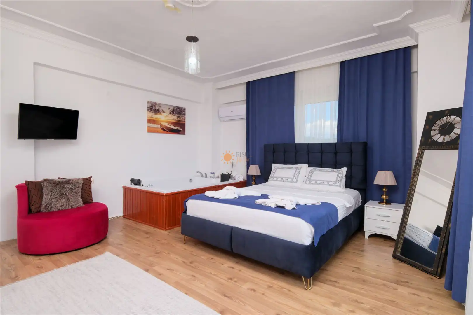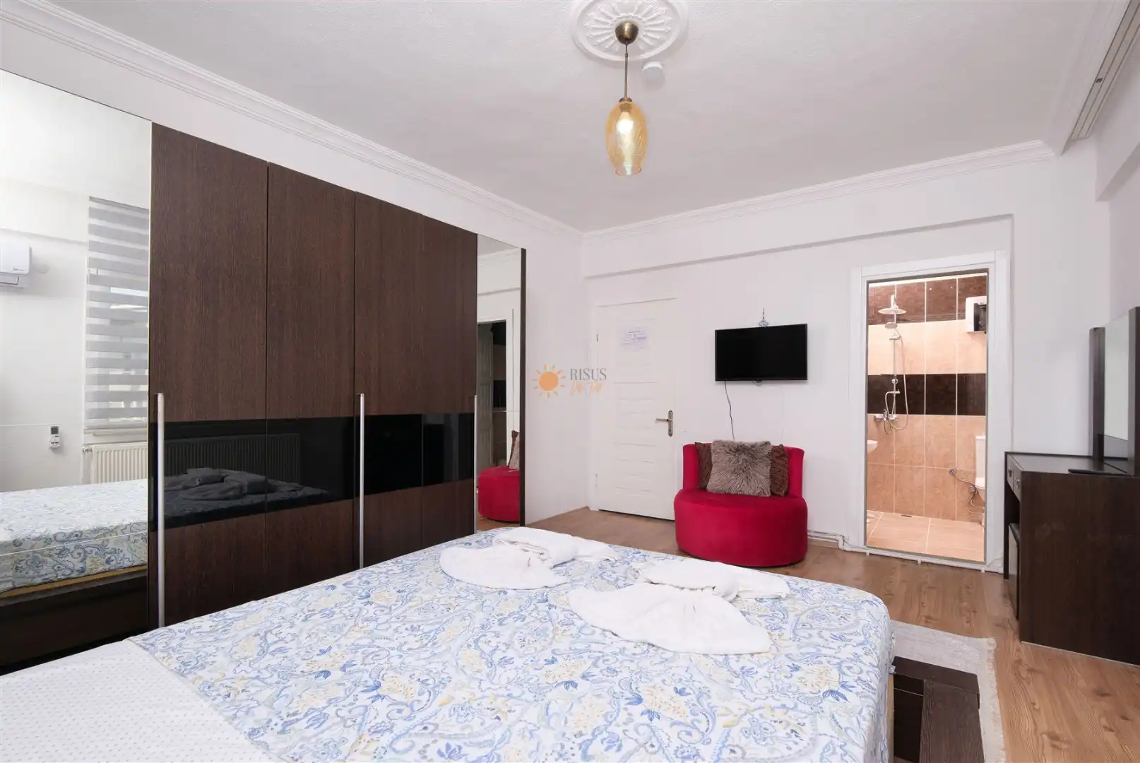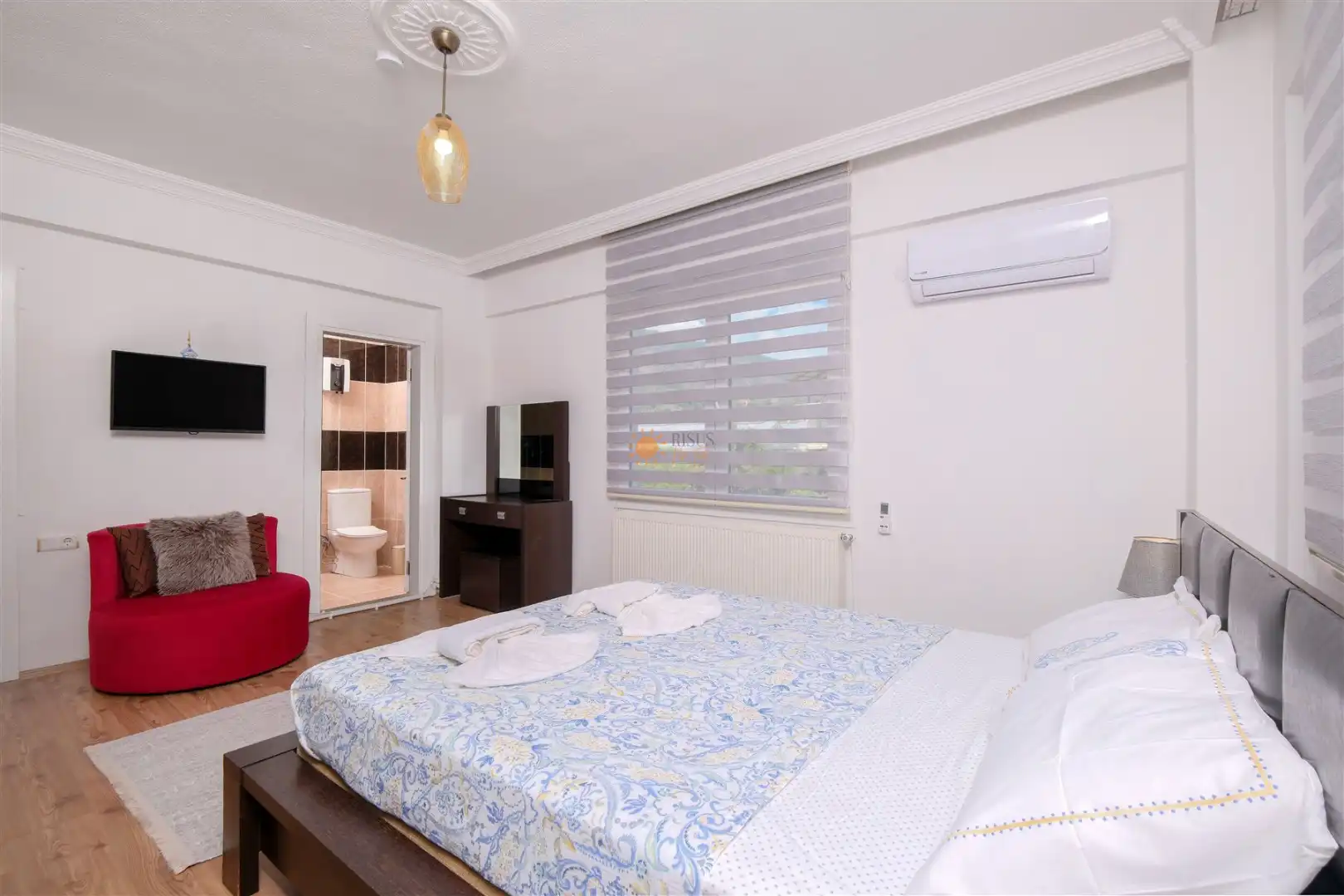 Çift Kişilik Yatak, Banyo/WC, TV, 2 Komodin, Elbise dolabı, Makyaj Masası, Klima
