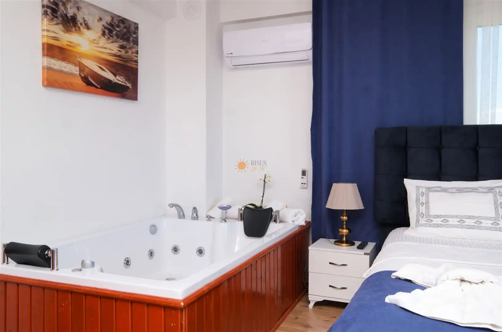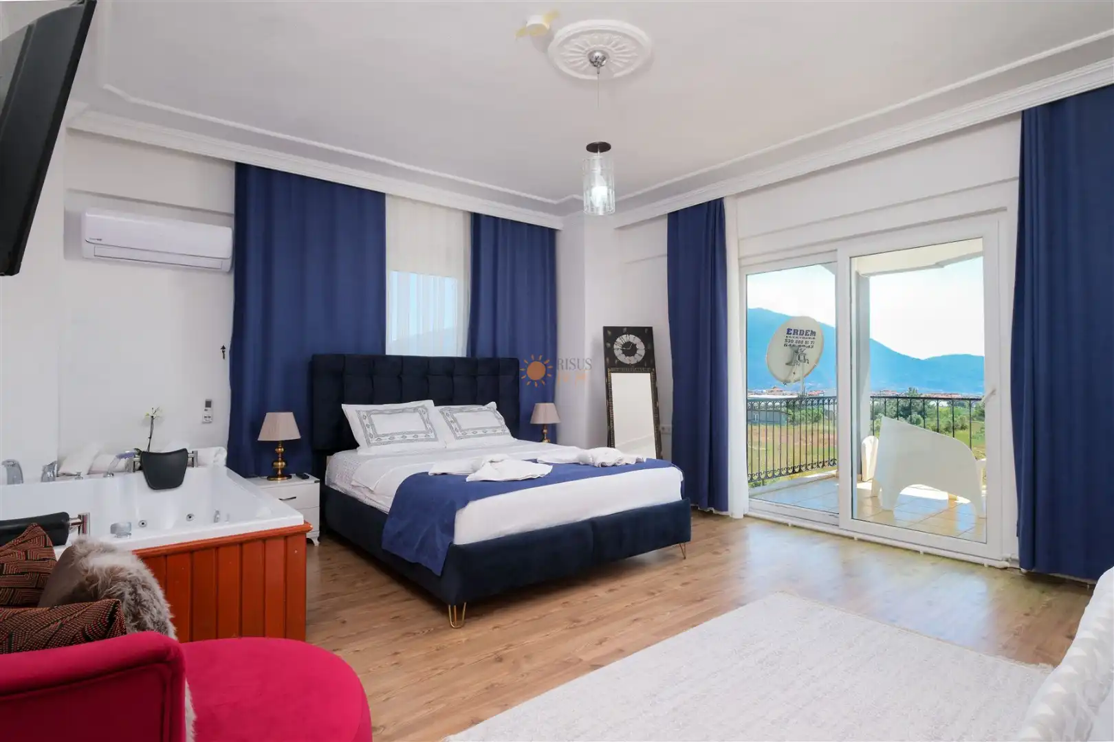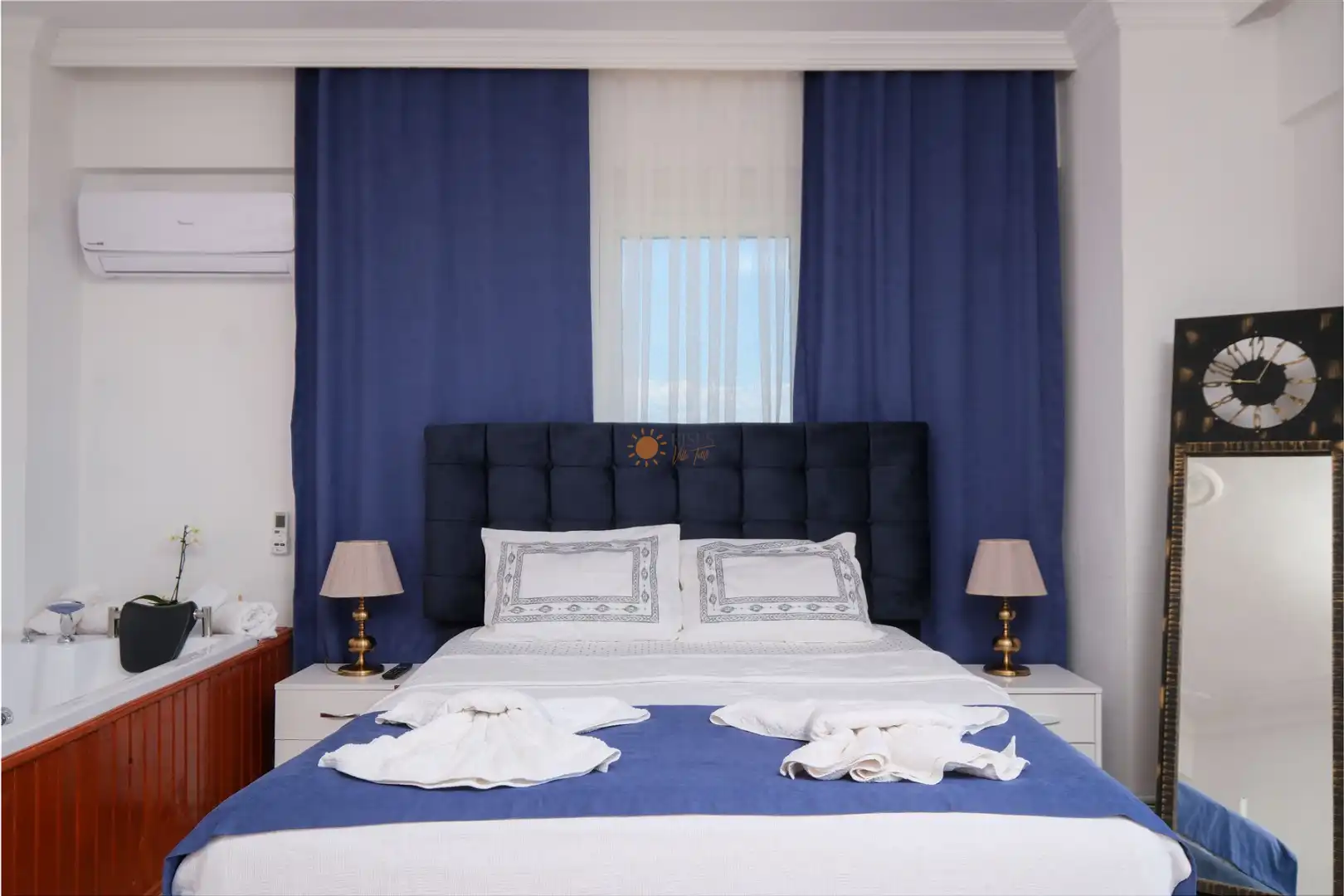 Çift Kişilik Yatak, Jakuzi, Banyo/WC, TV, 2 Komodin, Elbise dolabı, Klima