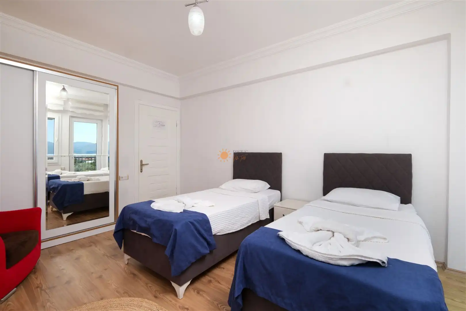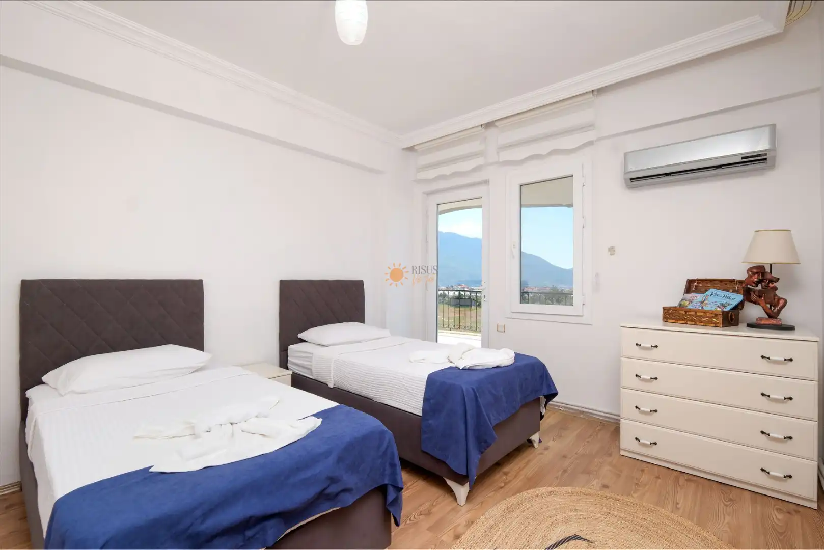2 Tek Kişilik Yatak, Banyo/WC, 2 Komodin, Elbise dolabı, Klima