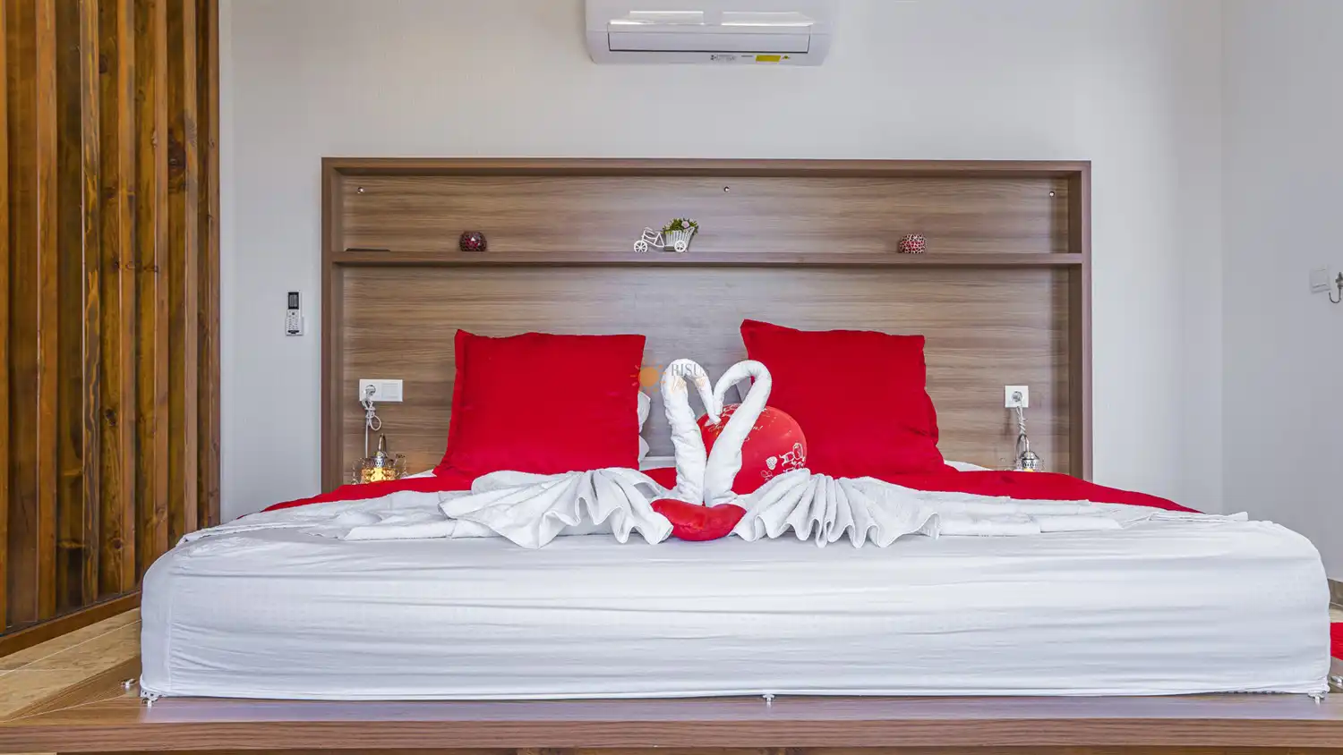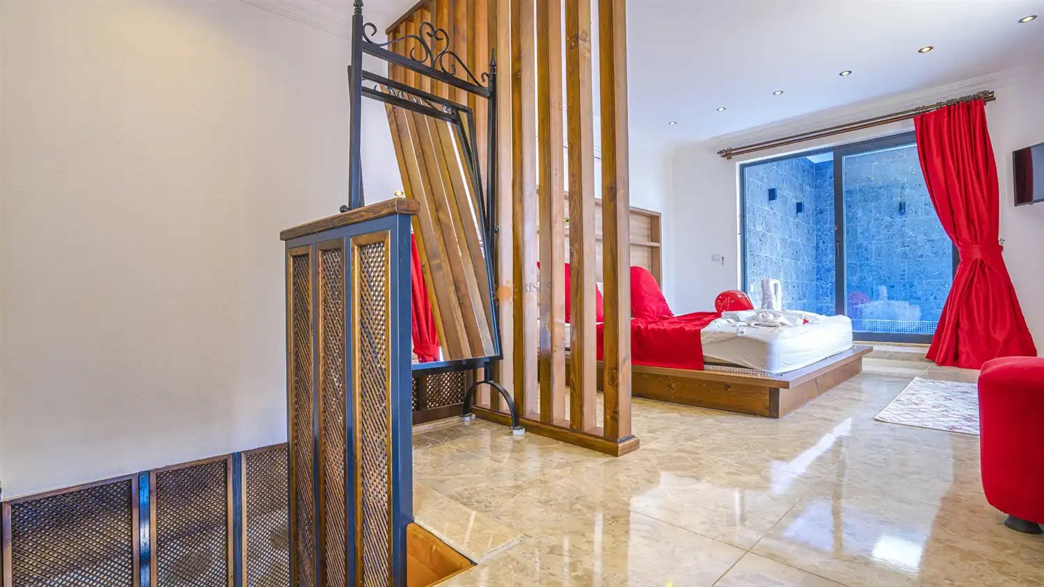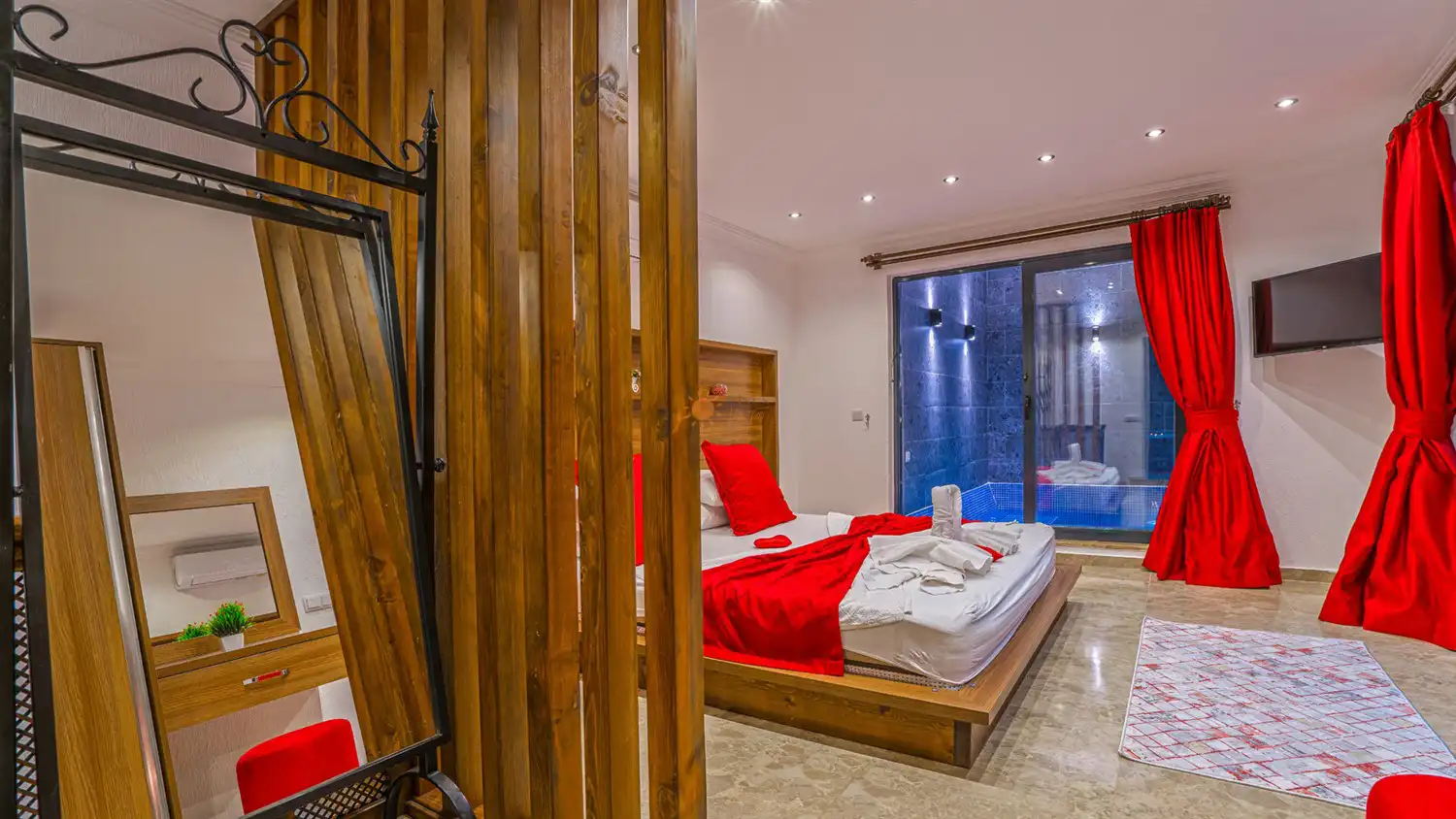 Çift Kişilik Yatak, Jakuzi, Banyo/WC, TV, 2 Komodin, Elbise dolabı, Makyaj Masası, Klima, Kapalı Havuz