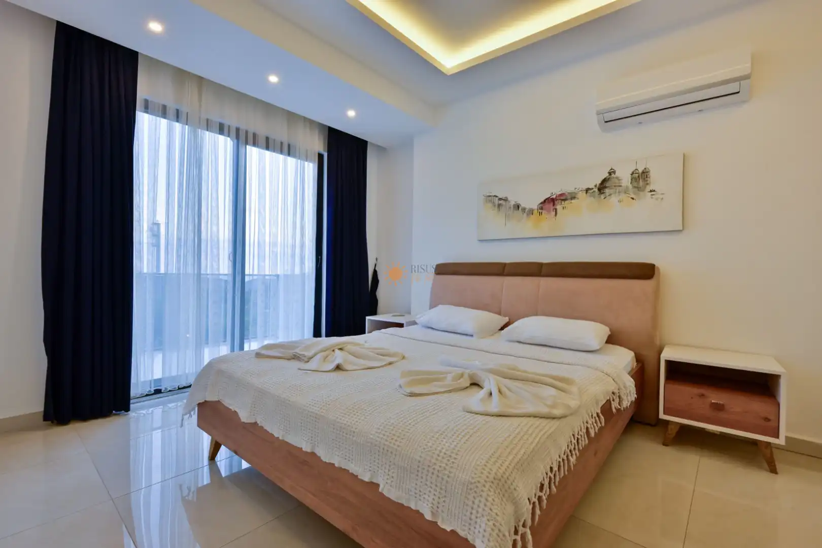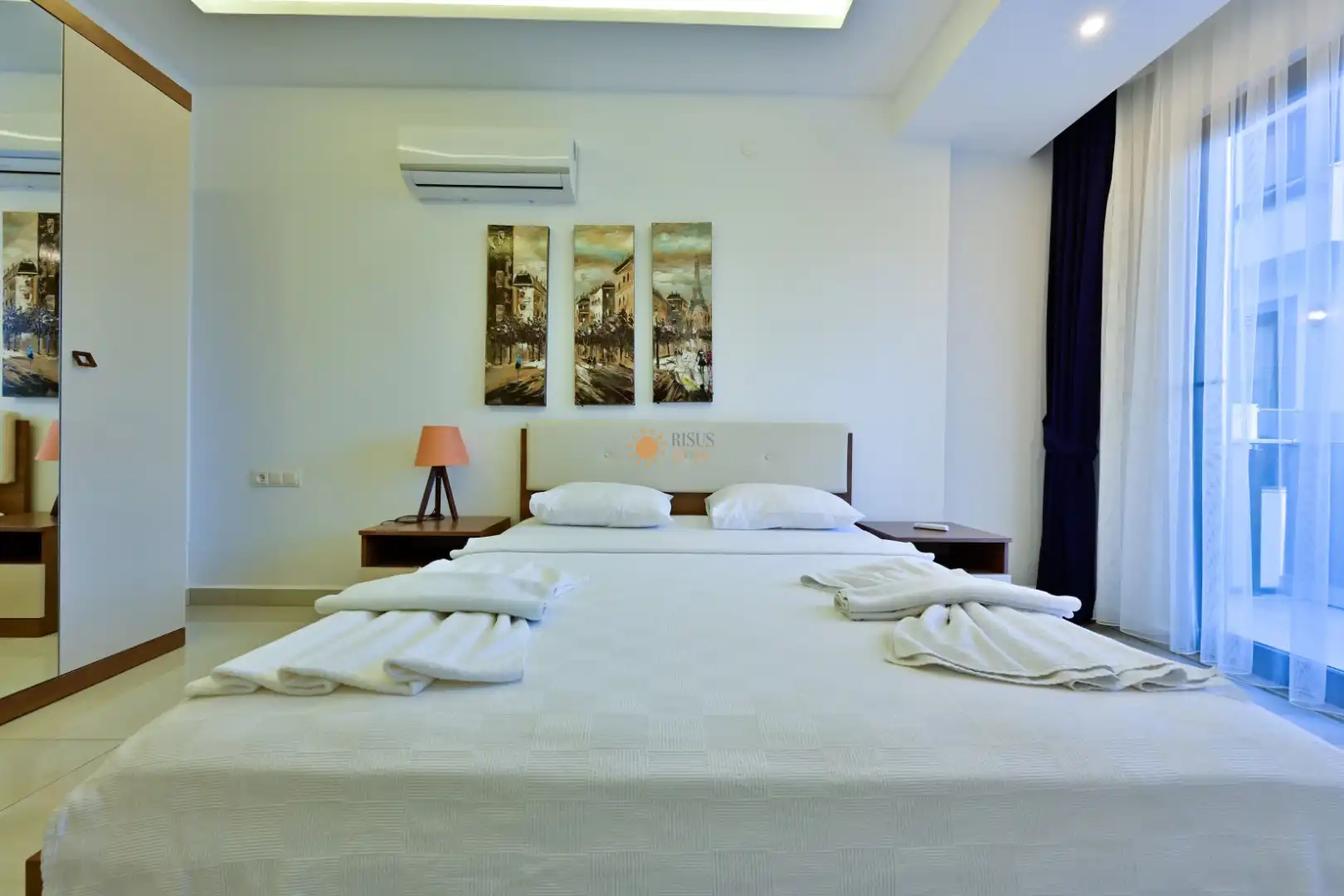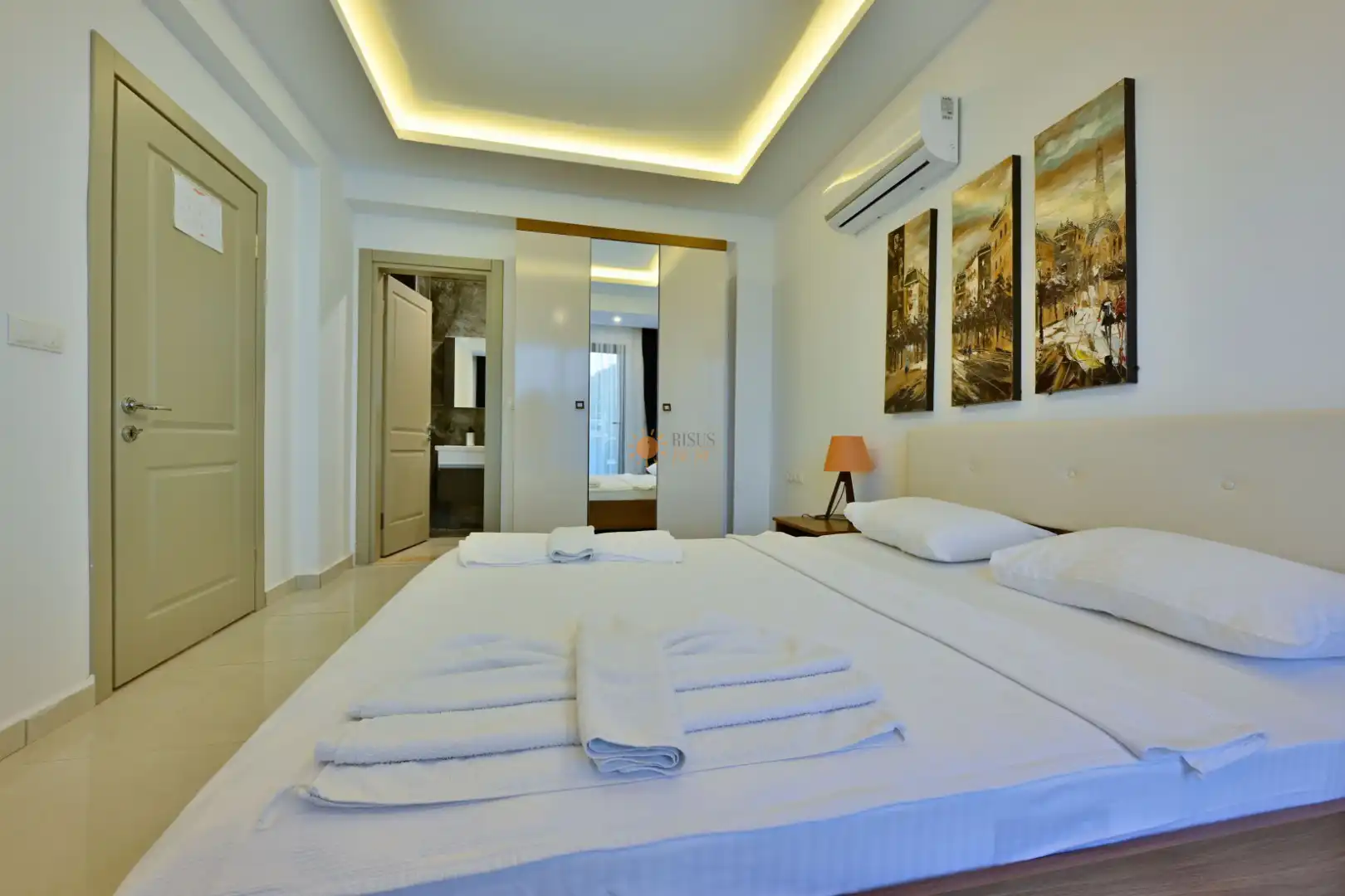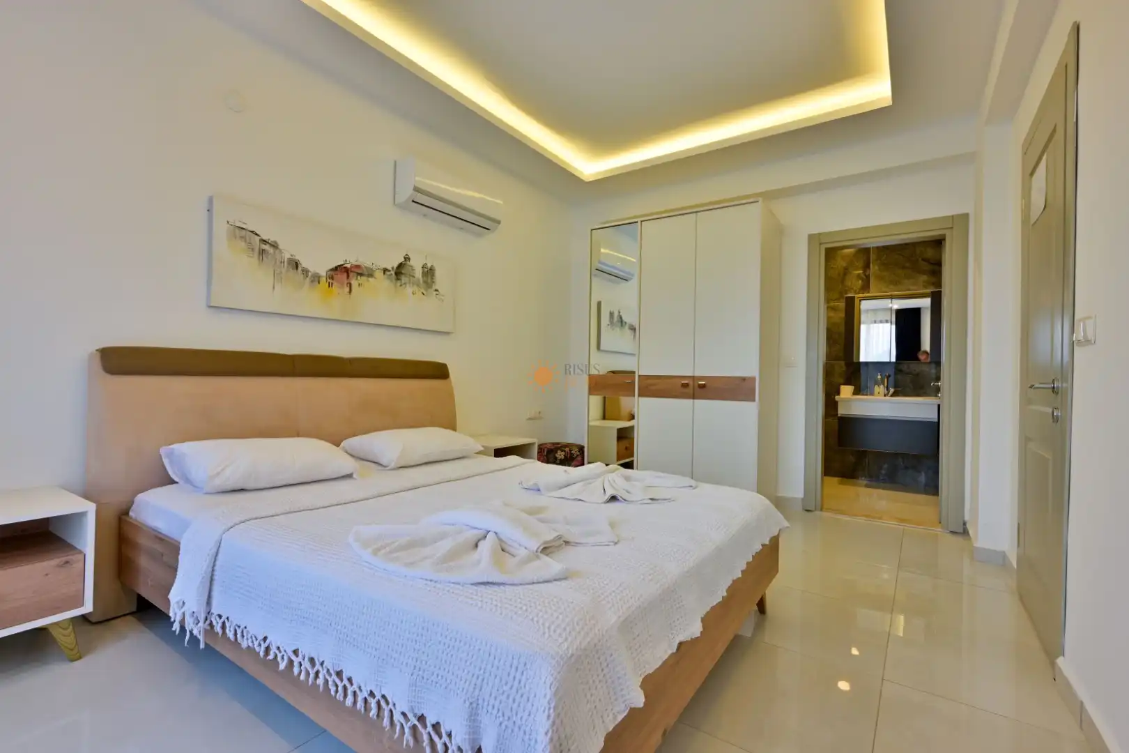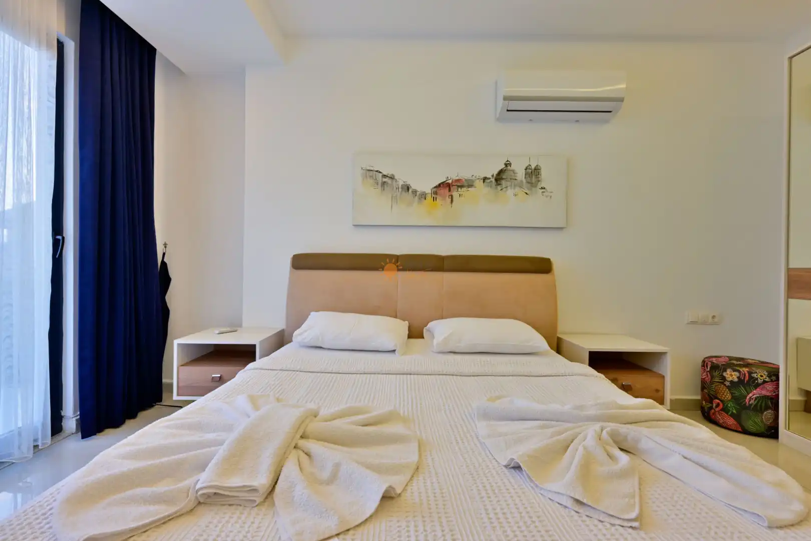 Çift Kişilik Yatak, Banyo/WC, 2 Komodin, Elbise dolabı, Makyaj Masası, Klima