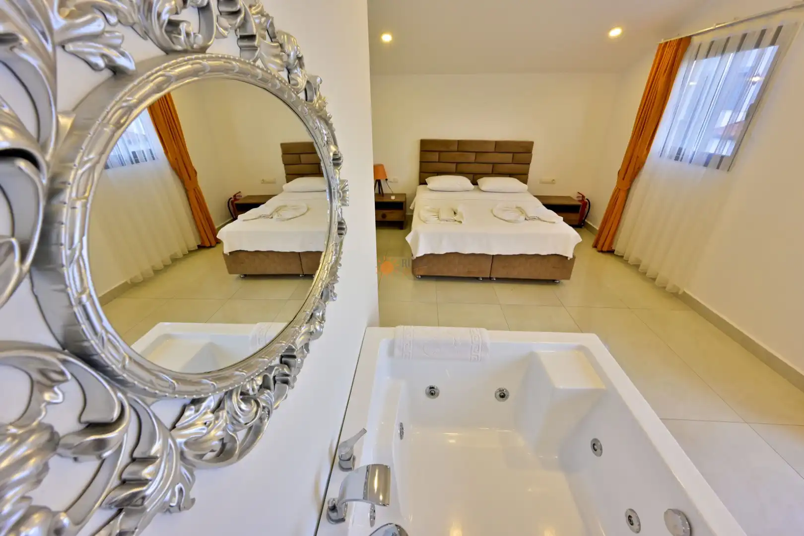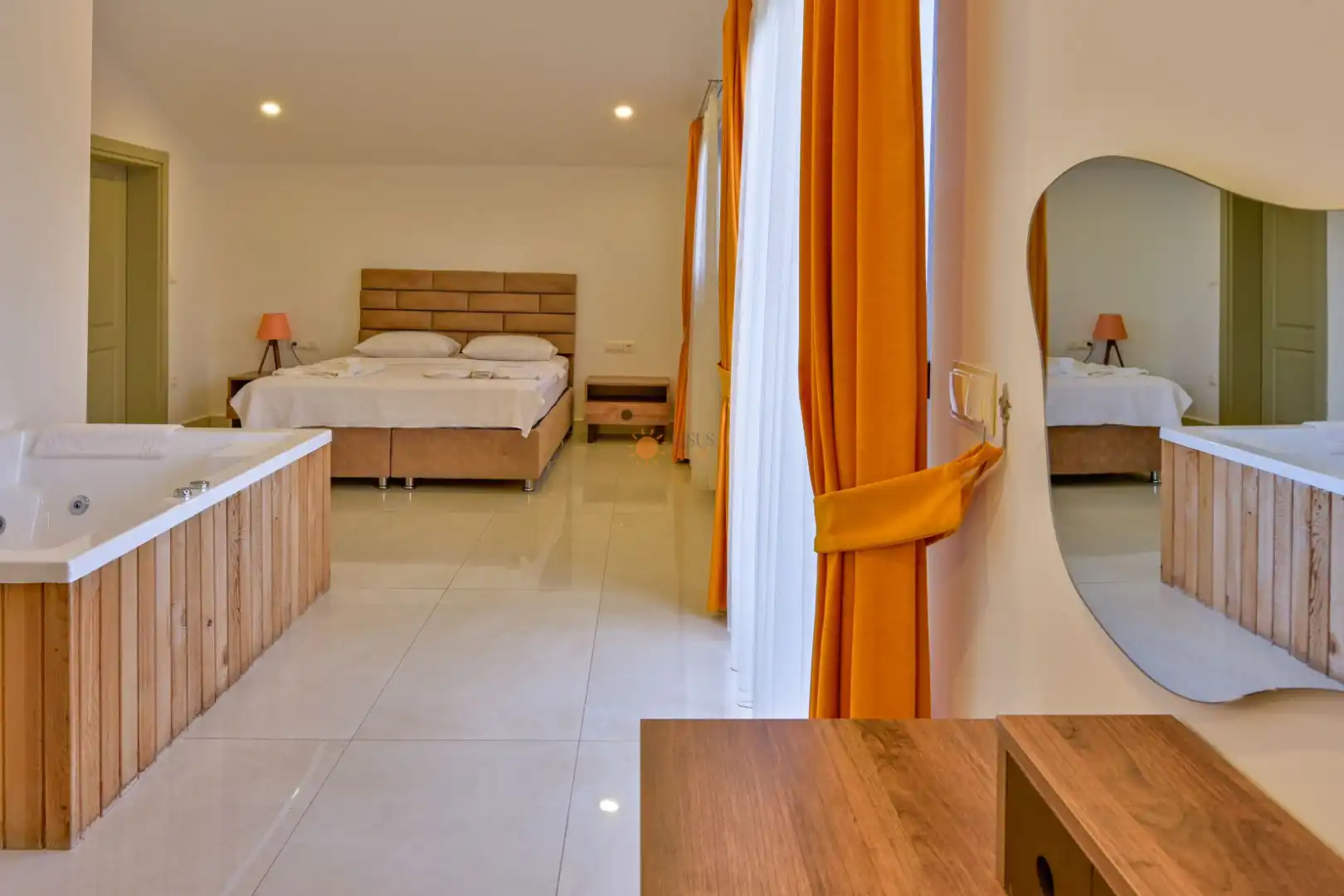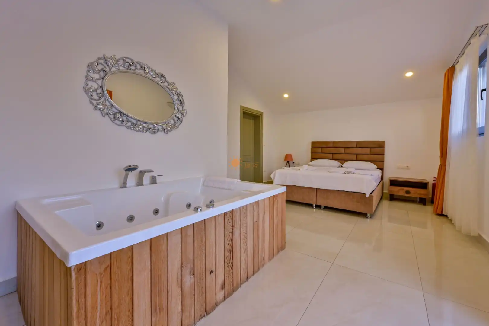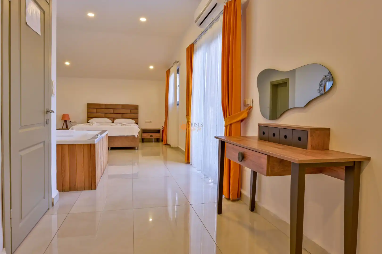 Çift Kişilik Yatak, Jakuzi, Banyo/WC, 2 Komodin, Elbise dolabı, Makyaj Masası, Klima