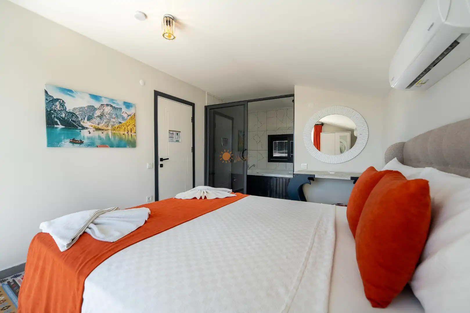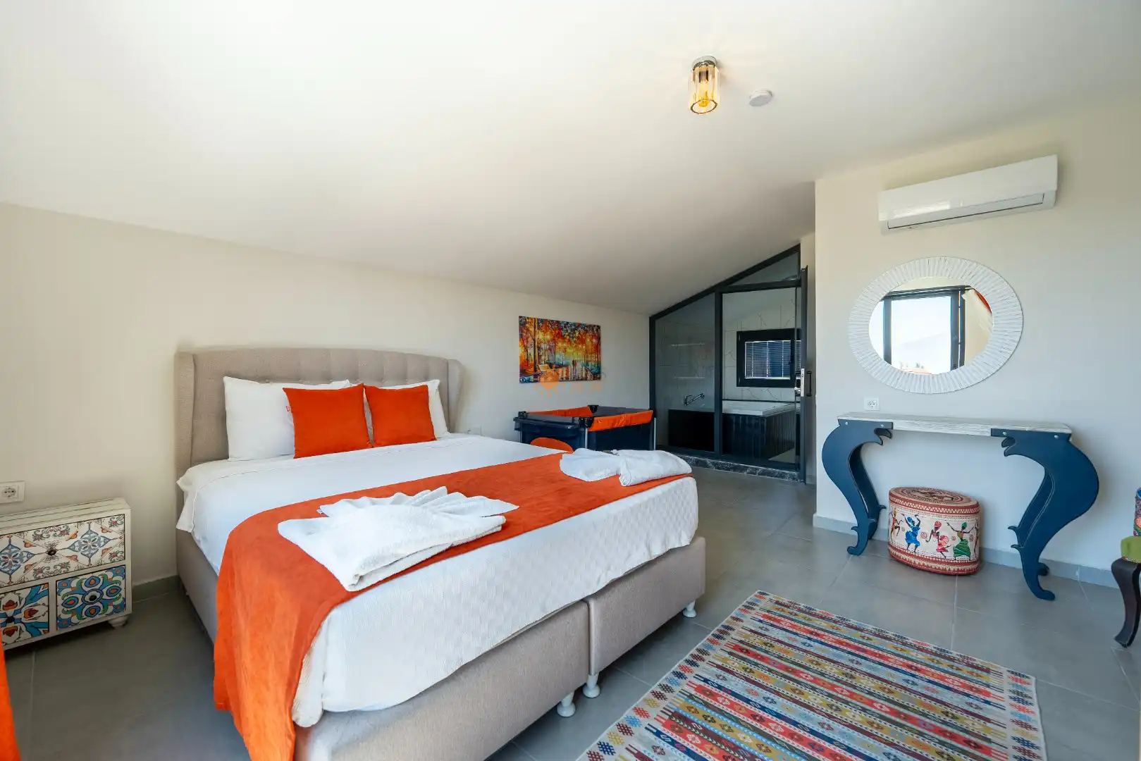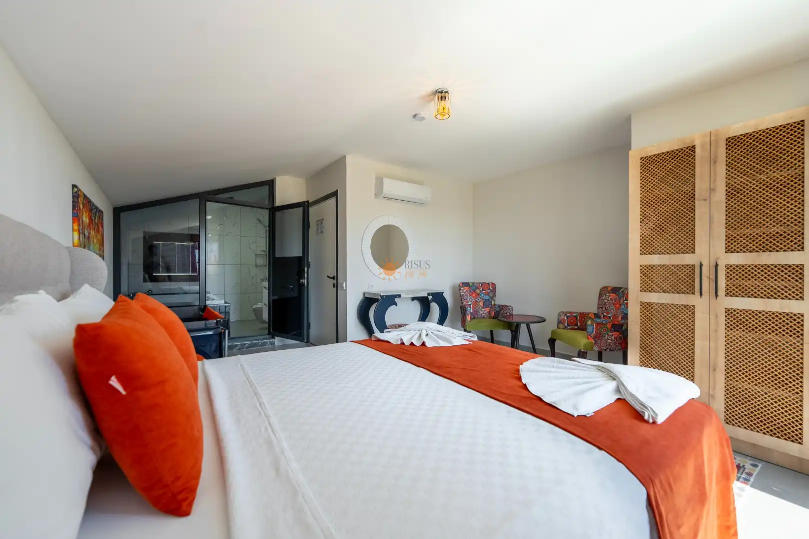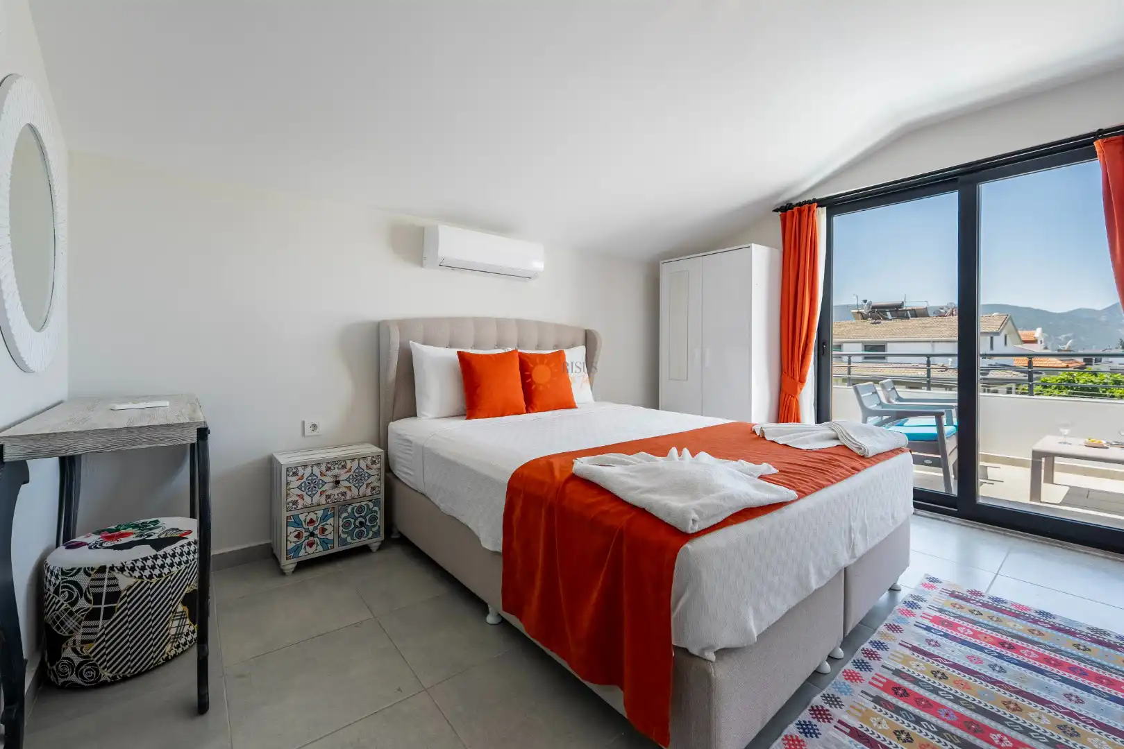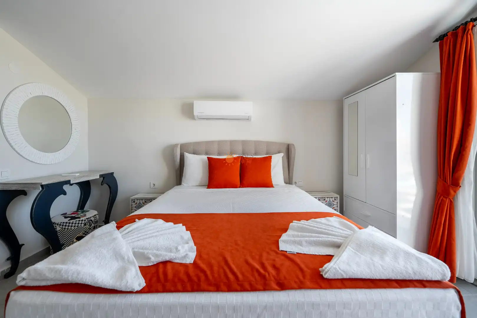 Çift Kişilik Yatak, Banyo/WC, 2 Komodin, Elbise dolabı, Makyaj Masası, Klima