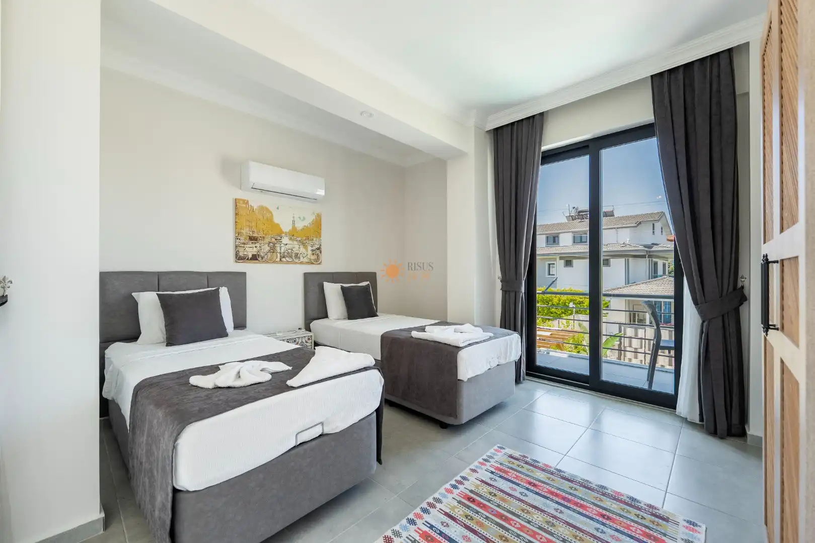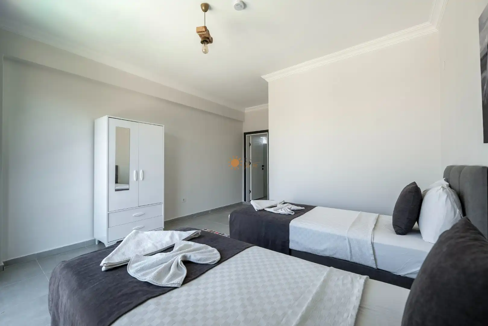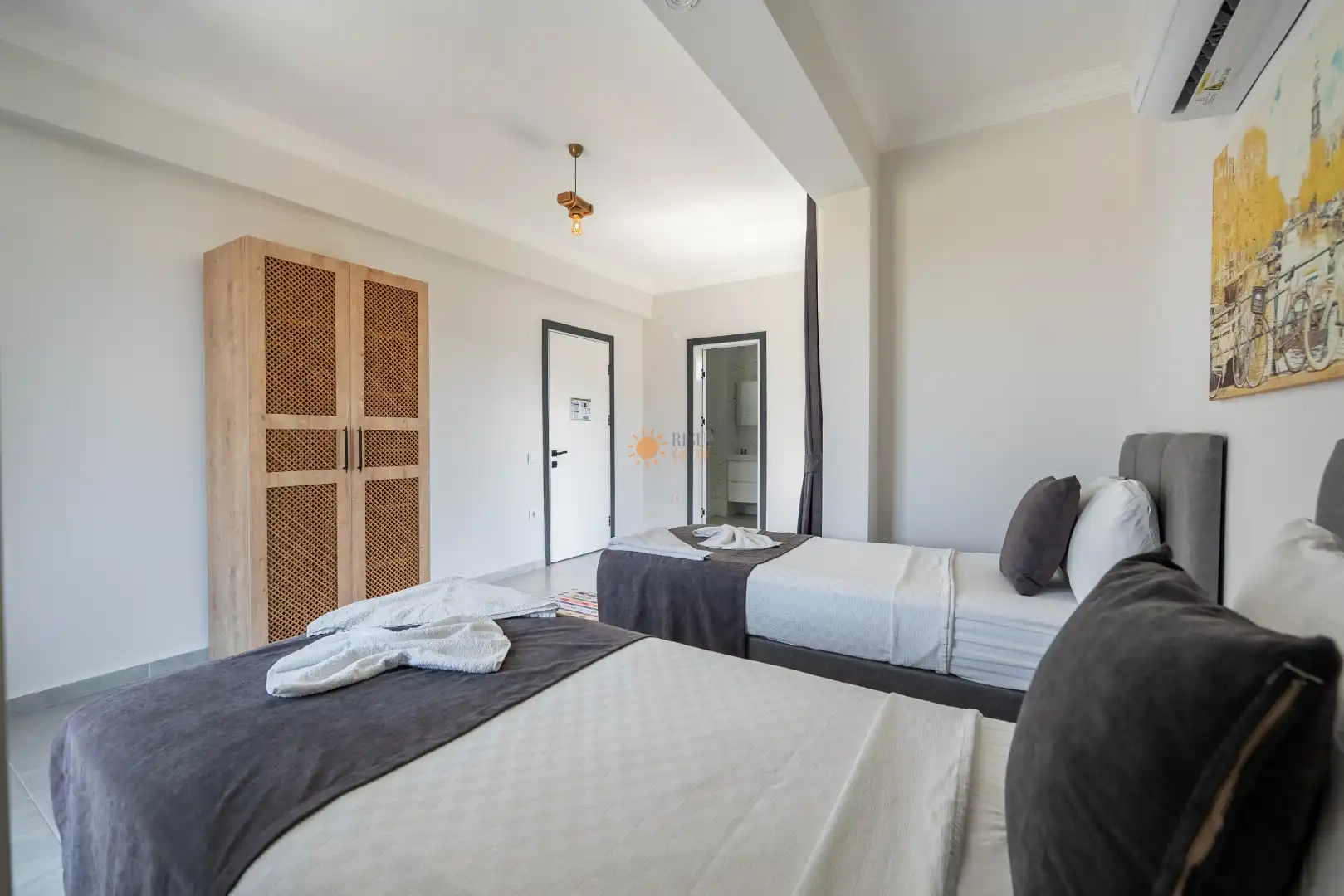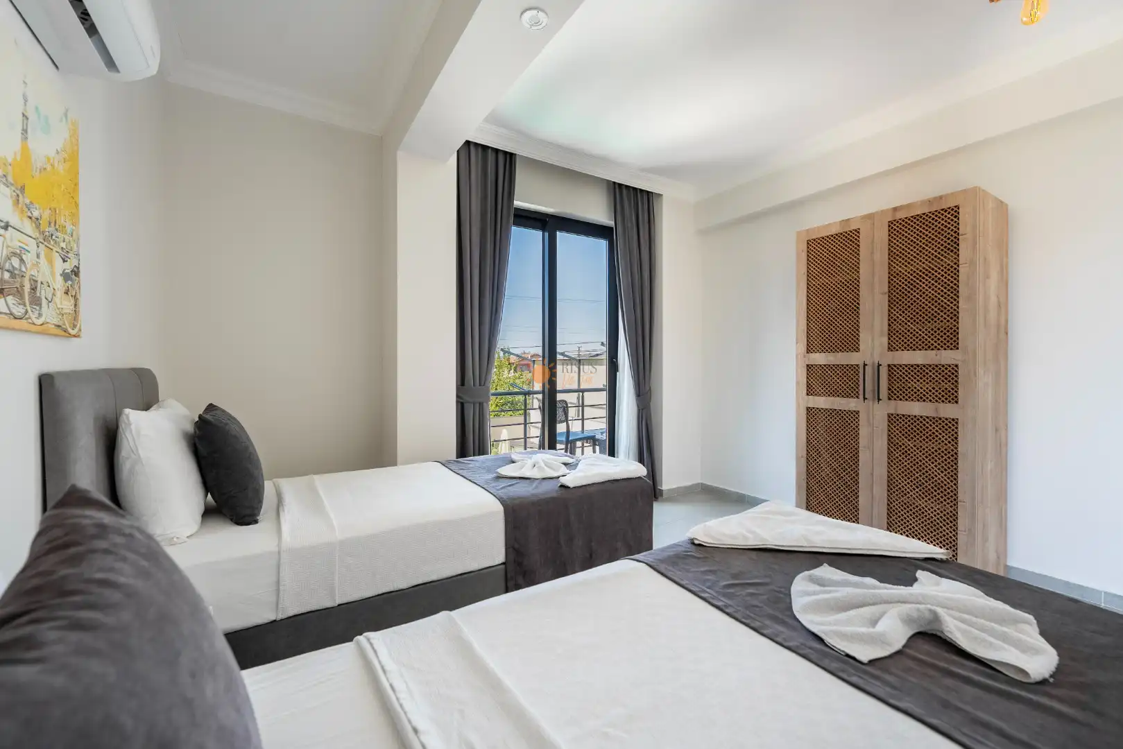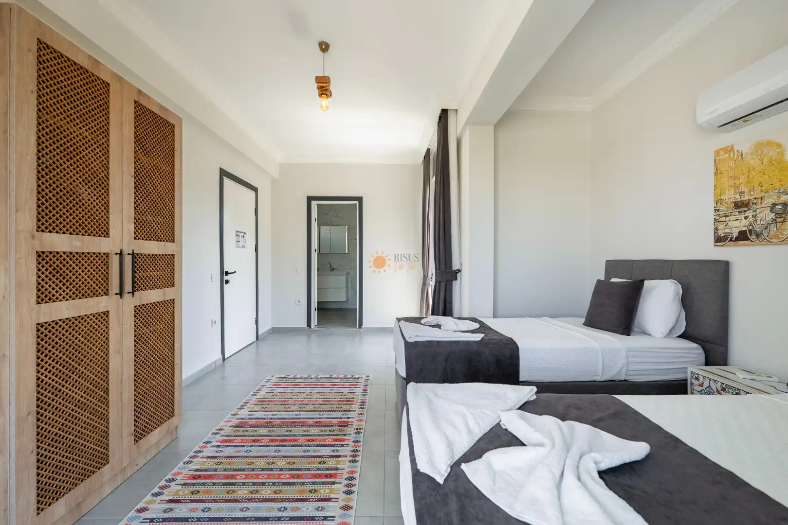 2 Tek Kişilik Yatak, Banyo/WC, Komodin, Elbise dolabı, Klima