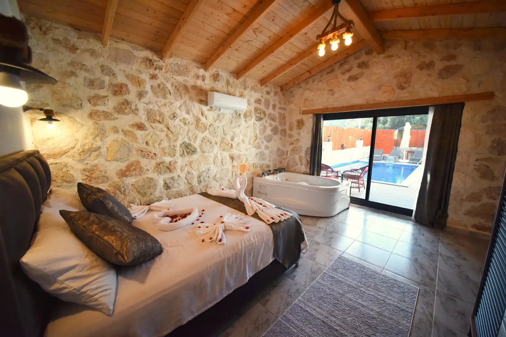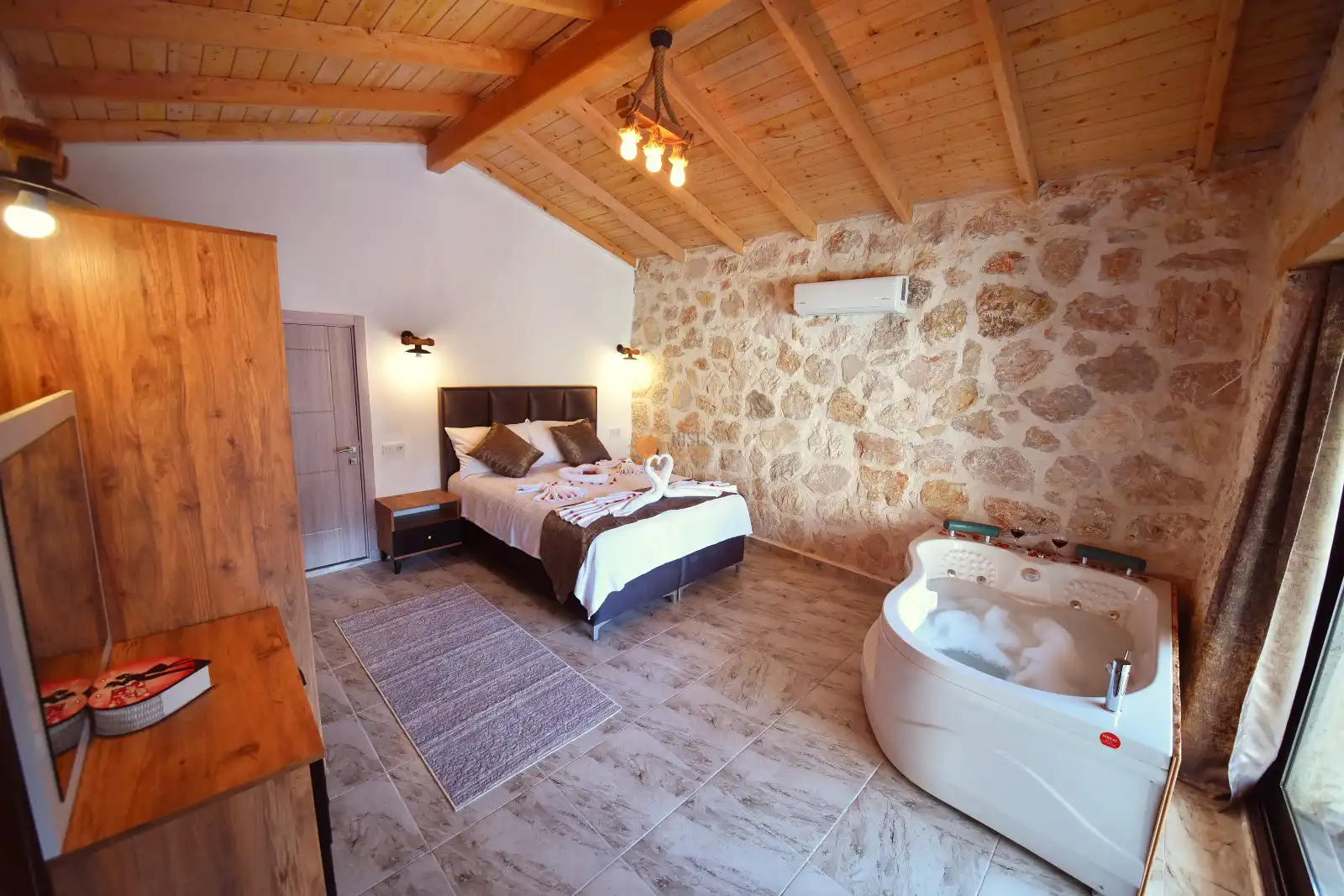 Çift Kişilik Yatak, Jakuzi, Banyo/WC, 2 Komodin, Elbise dolabı, Klima