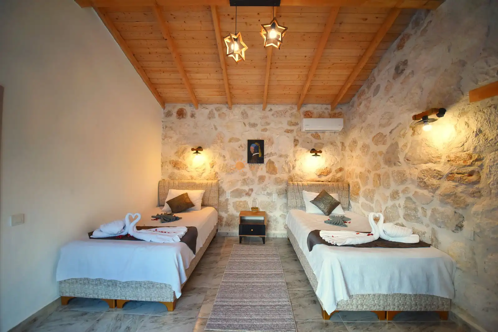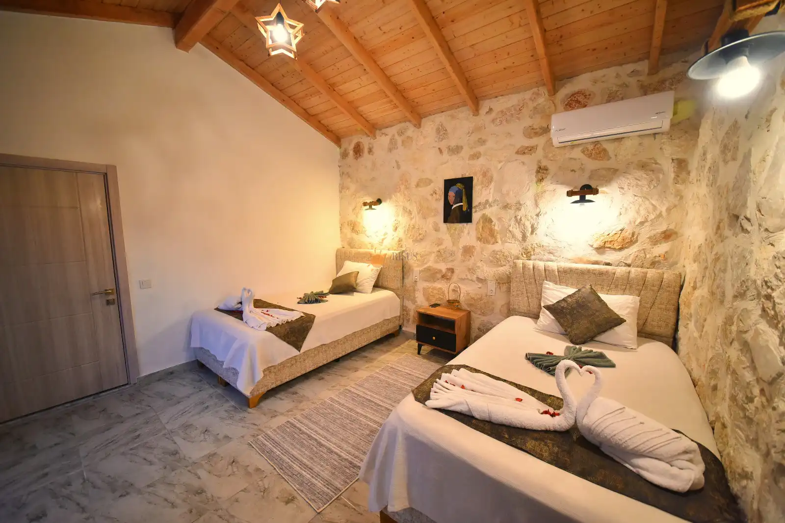 2 Tek Kişilik Yatak, Banyo/WC, TV, Komodin, Elbise dolabı, Klima