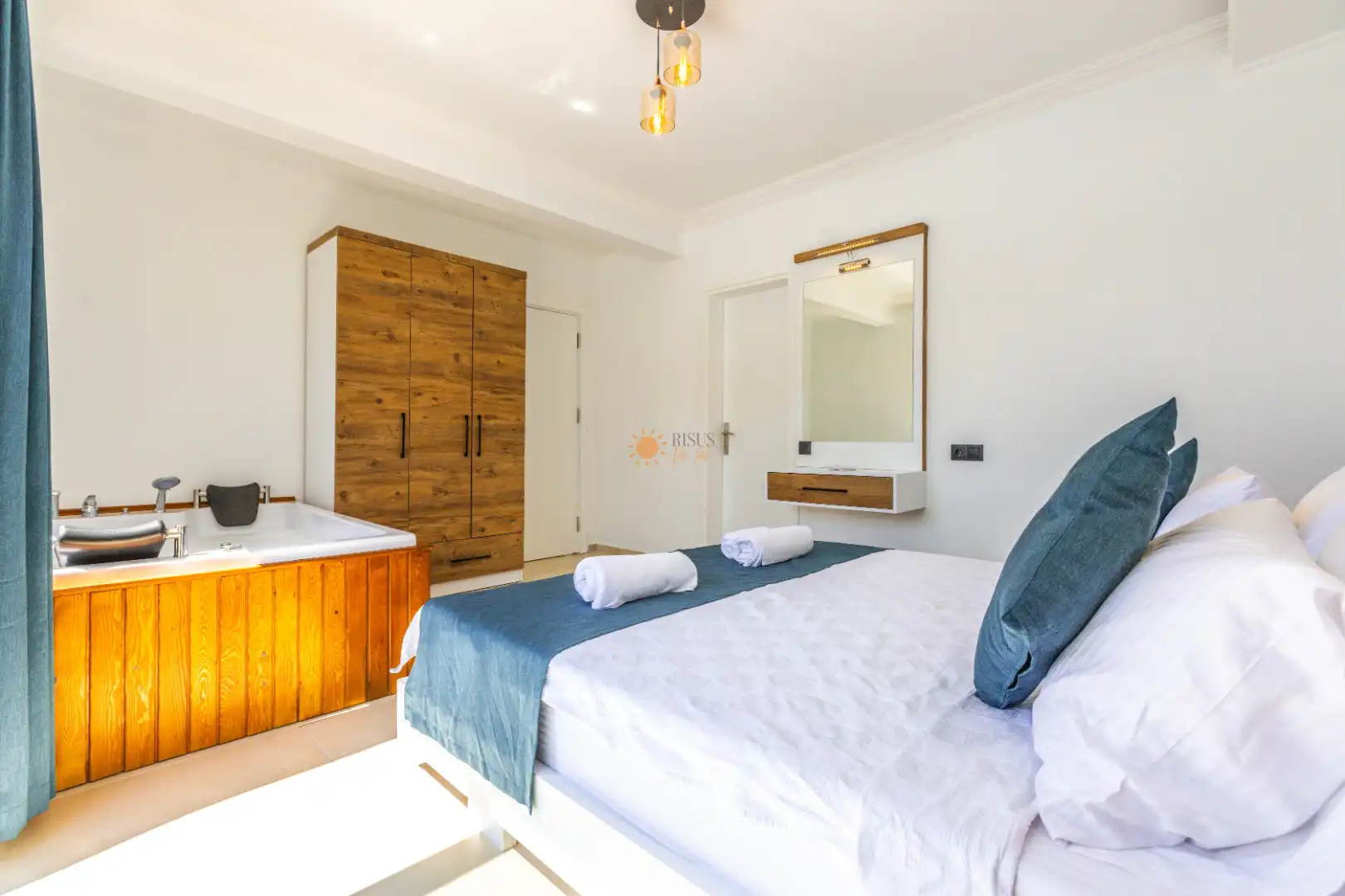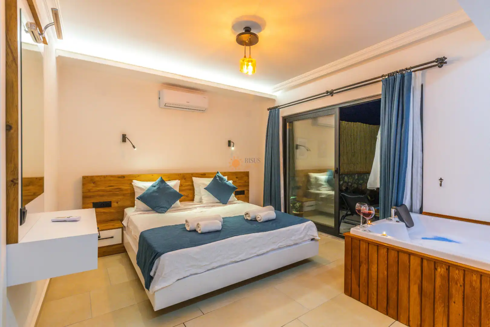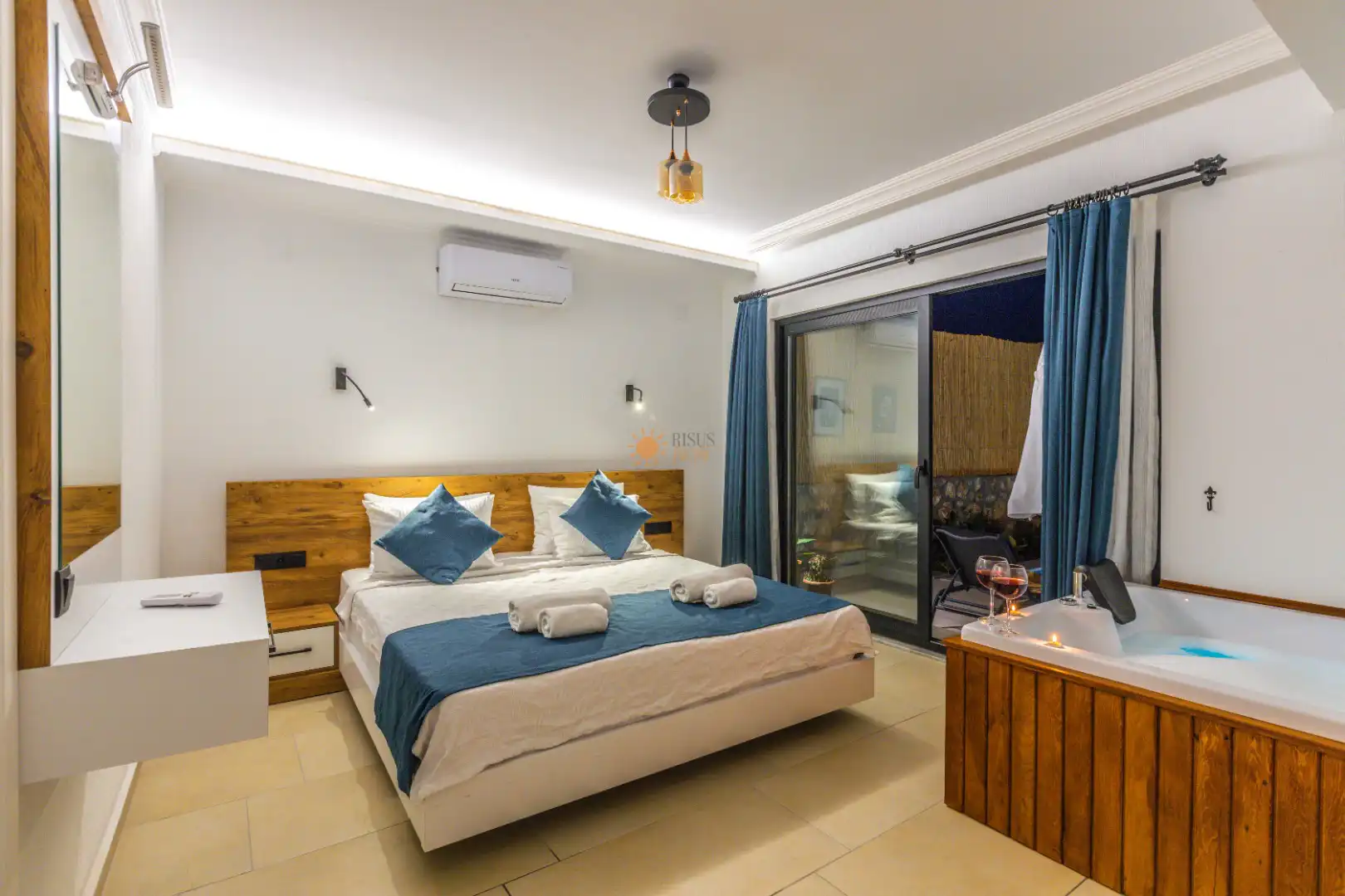 Çift Kişilik Yatak, Jakuzi, Banyo/WC, 2 Komodin, Elbise dolabı, Makyaj Masası, Klima