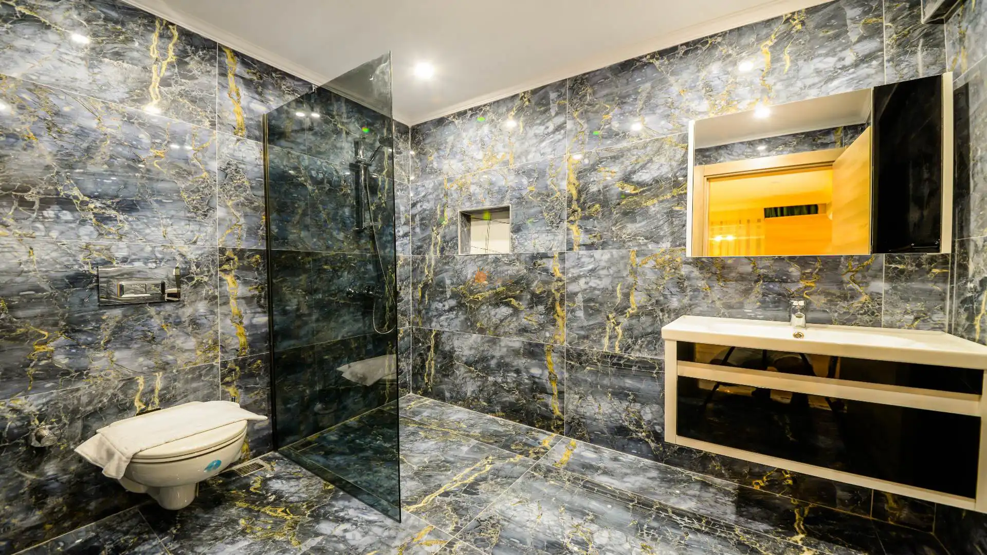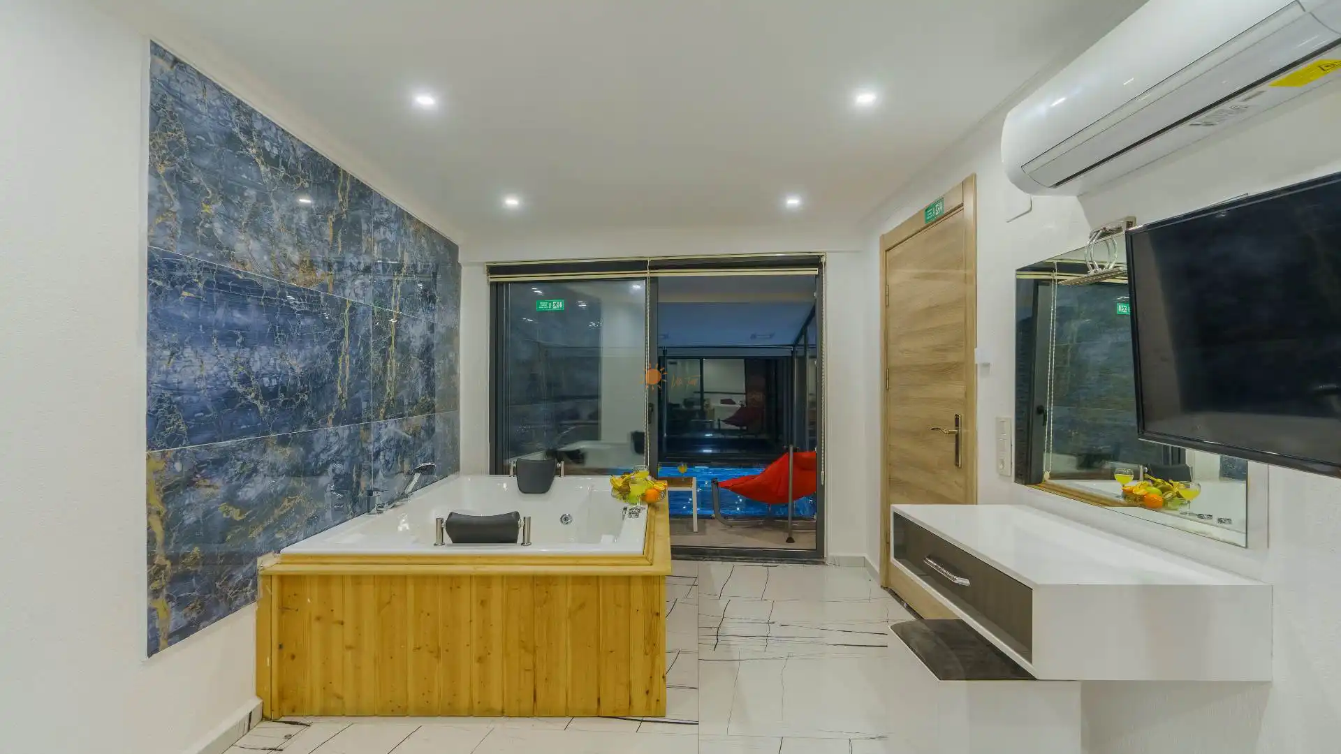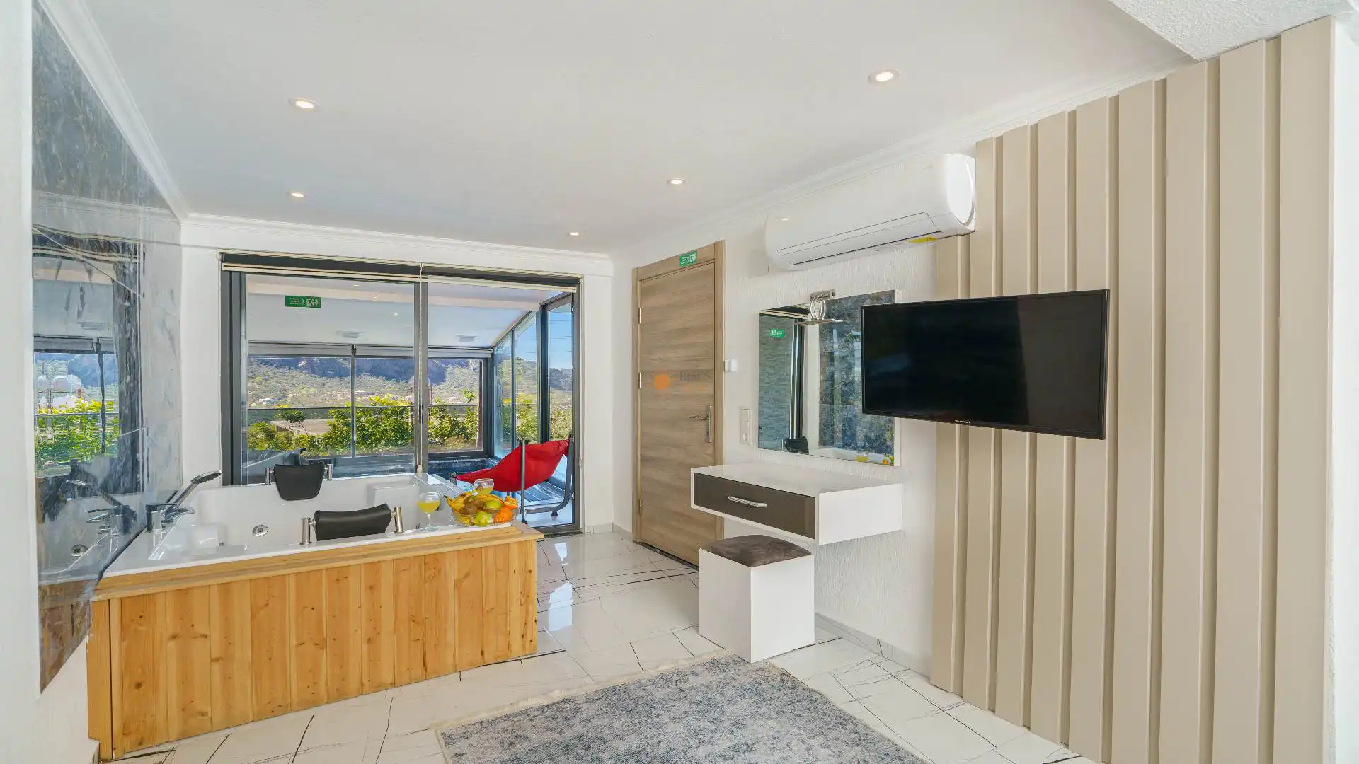 Çift Kişilik Yatak, Jakuzi, Banyo/WC, TV, 2 Komodin, Elbise dolabı, Makyaj Masası, Klima